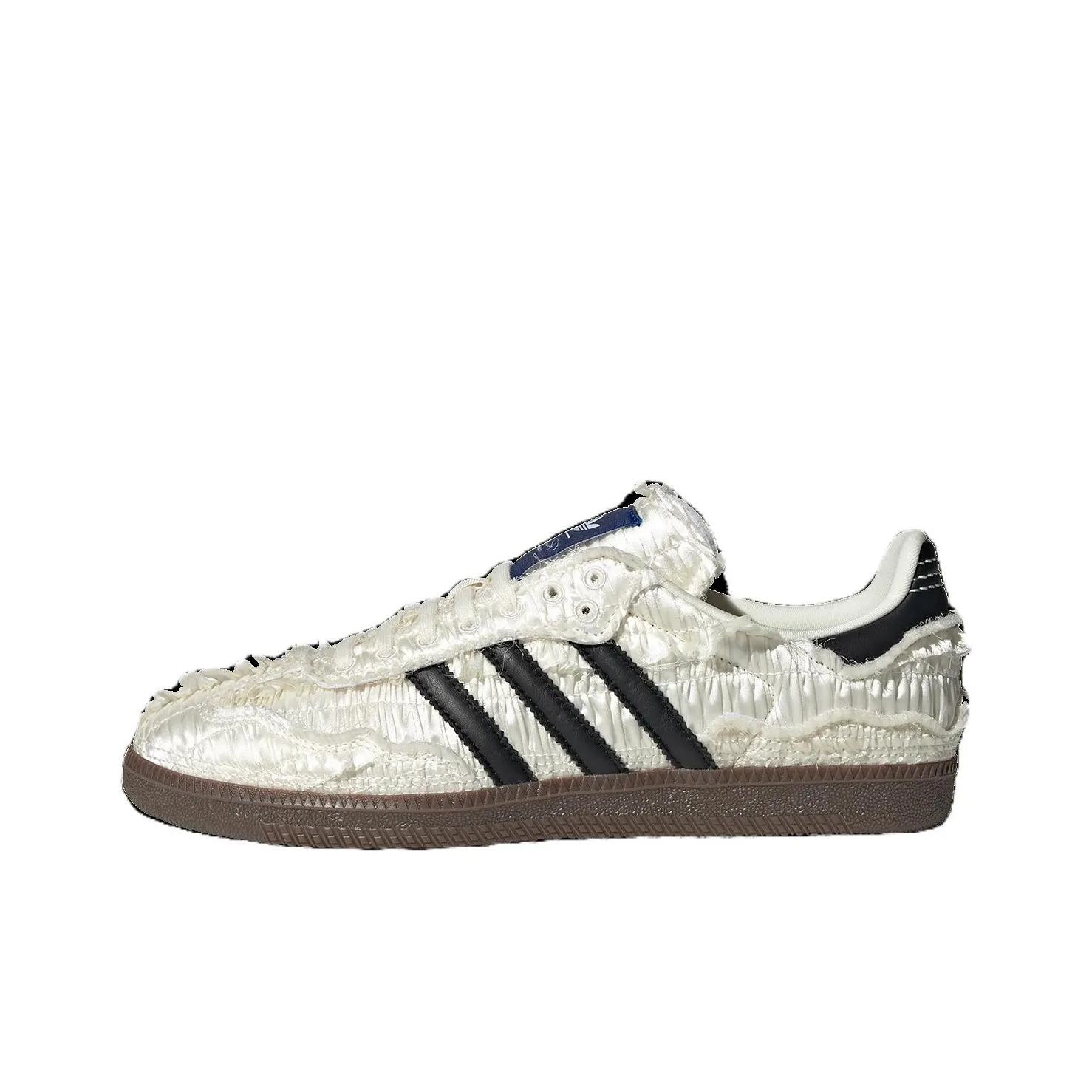 When checking the Adidas Samba Reverie By Caroline Hú Clot White Textured Silk Upper, focus on the appearance. Authentic pairs will have a luxurious feel, with the silk upper appearing smooth and well-finished. The rubber sole should be sturdy, and the overall construction should reflect high-quality craftsmanship.