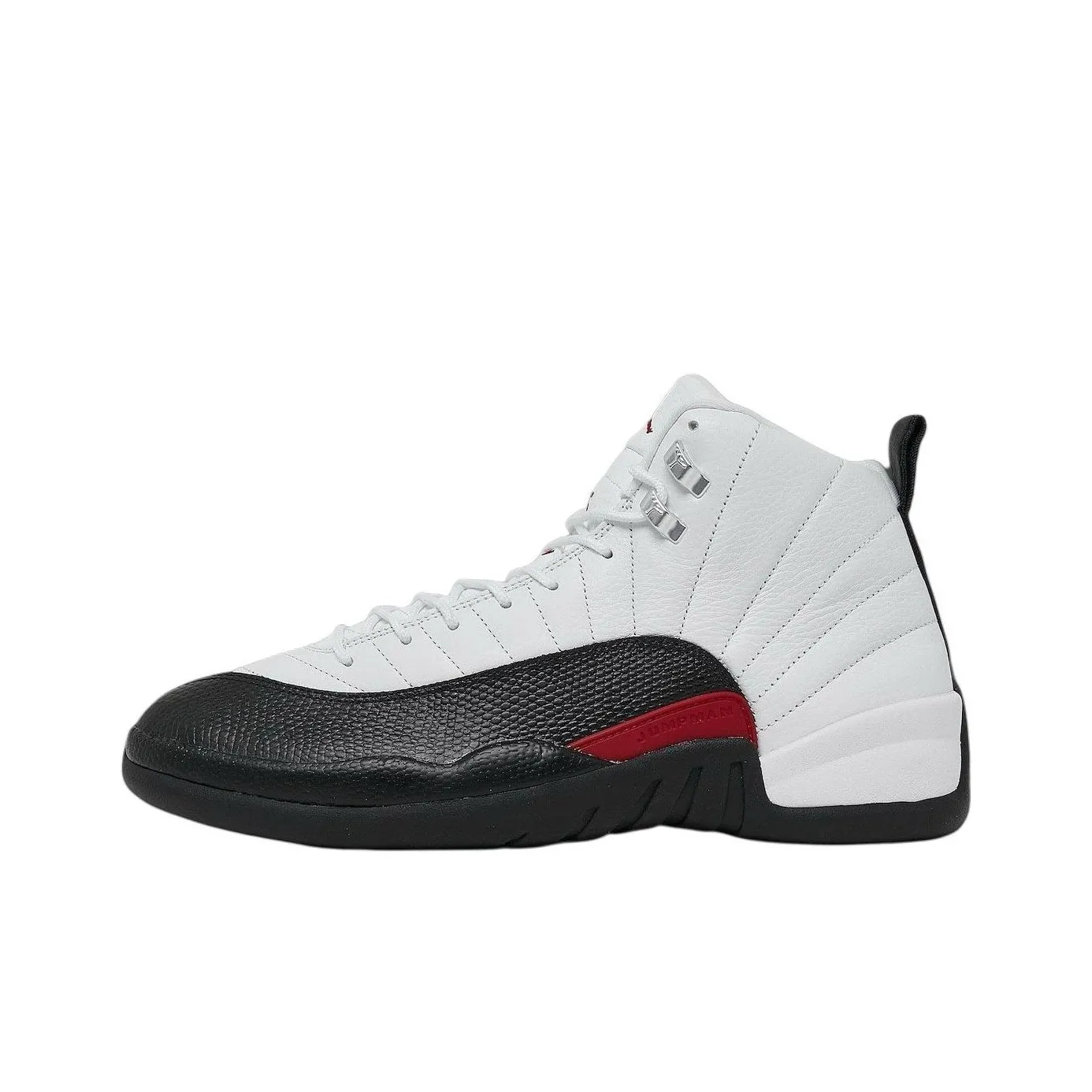 When assessing the authenticity of the Air Jordan 12 'Red Taxi', focus on the appearance. The shoe should showcase a clean white color scheme with black and red accents, and the Jumpman logo should be clearly visible. The materials should feel premium, and the stitching should be precise.