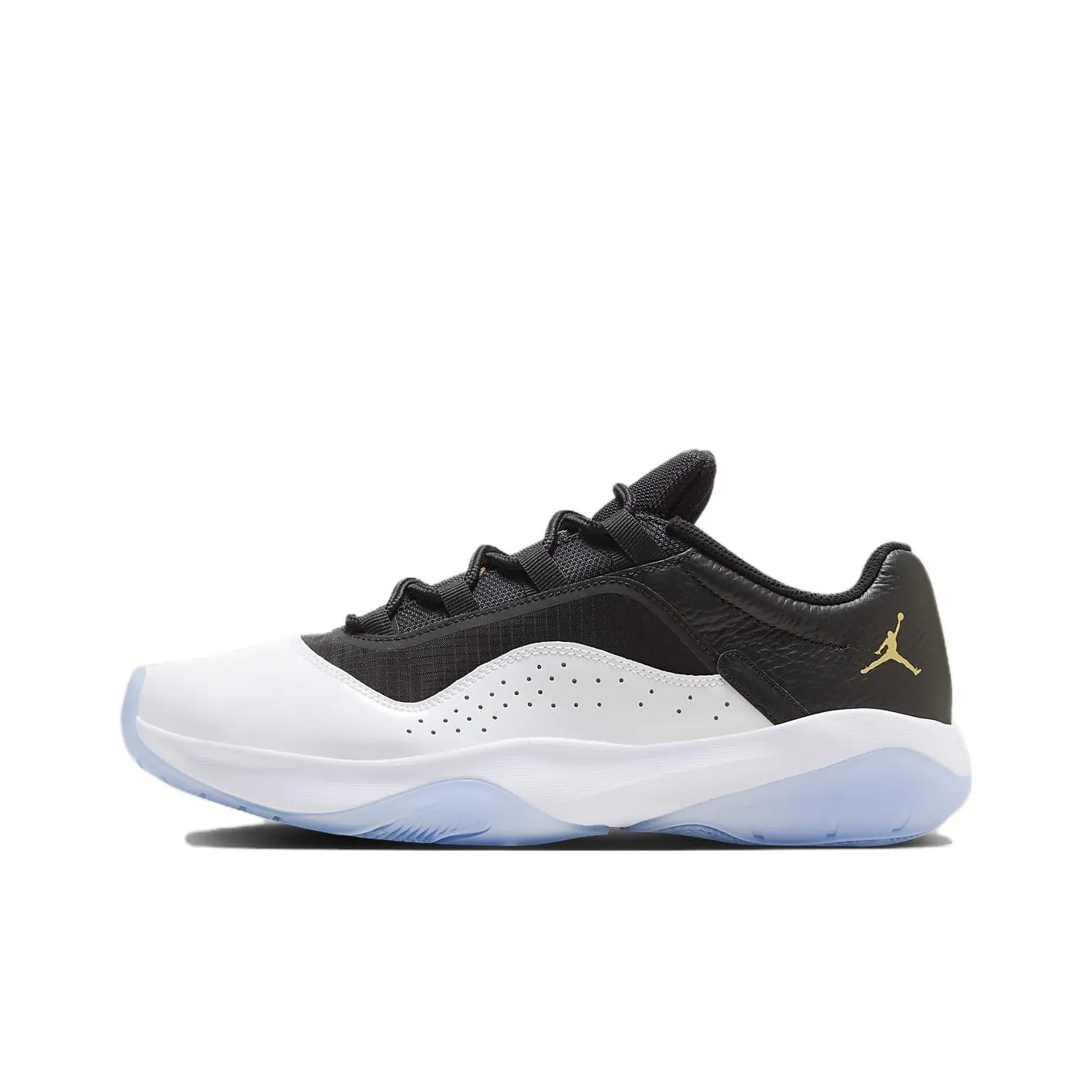 To identify the authenticity of the Jordan 11 CMFT Low 'Black White Gold', examine the patent leather upper for a glossy finish and smooth texture. Authentic pairs will have consistent stitching and no loose threads. The rubber sole should feel sturdy and have a clear tread pattern. Check the color scheme; the black and white should be vibrant without any fading. The logo should be crisp and well-defined, with no smudging.