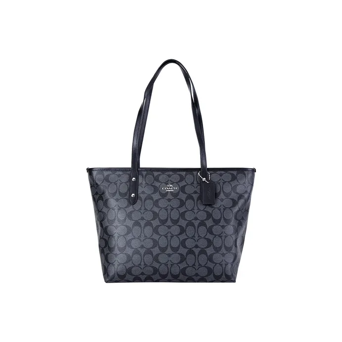 When assessing this COACH City Zip Tote, examine the black color scheme and overall design. Authentic bags will have a smooth finish and even stitching. The PVC material should feel durable and high-quality.