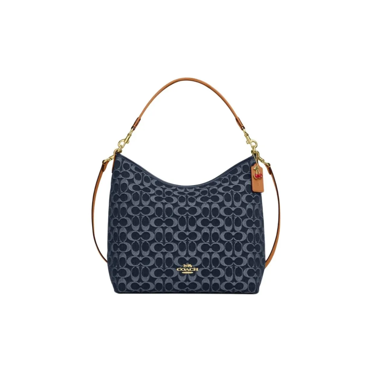 For the COACH Rowan Handbag, authenticity can be verified by inspecting its appearance. Authentic bags have a polished finish, with no signs of wear or damage. The denim blue color should be vibrant and consistent throughout the bag. The print elements should be sharp and clear, with no smudging or fading. Additionally, the zipper should operate smoothly, indicating quality craftsmanship.