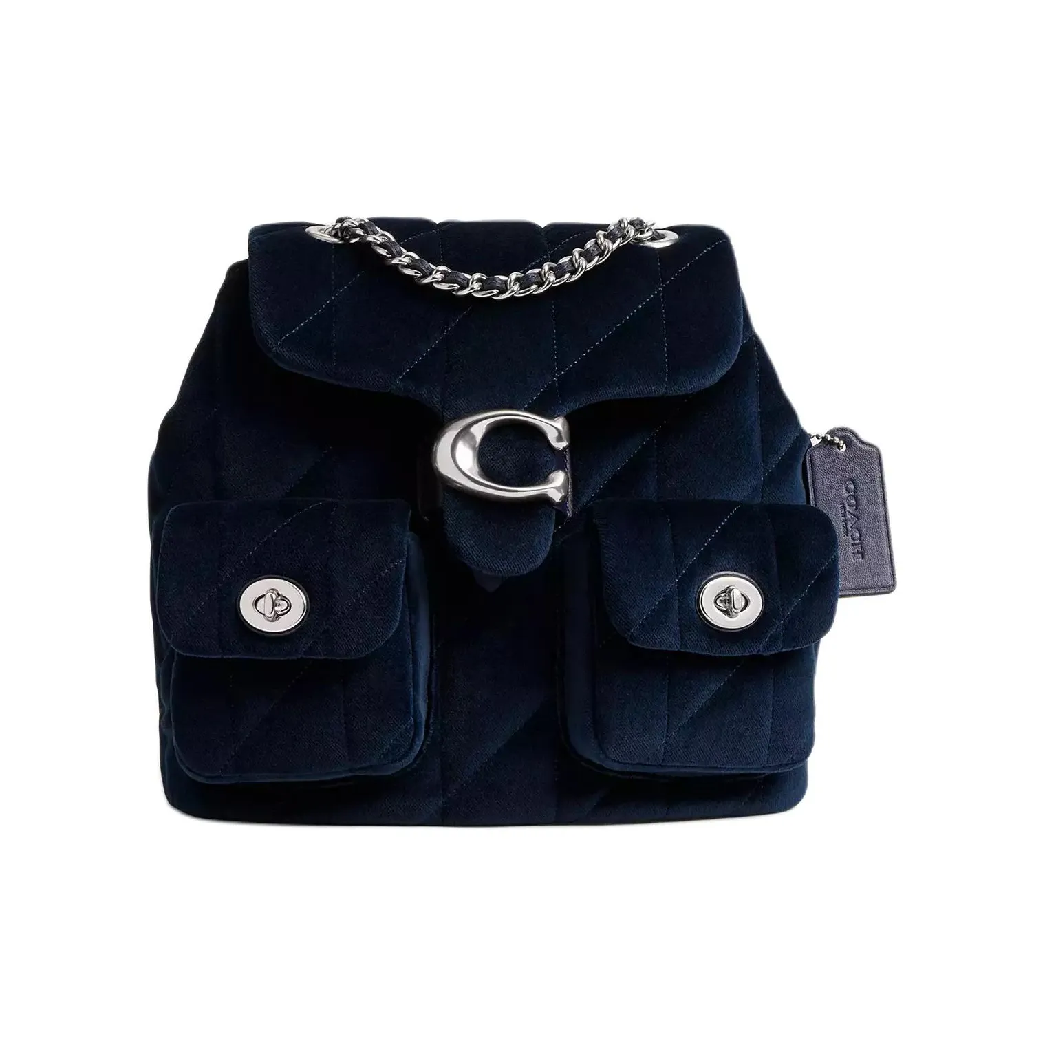 For the COACH Tabby Velvet Backpack, check the texture and quality of the velvet material. Authentic COACH velvet should feel soft and luxurious, with a rich color that is consistent throughout. Inspect the stitching for precision and ensure there are no loose threads or uneven seams. The hardware should be high-quality, functioning smoothly without any signs of rust or wear.
