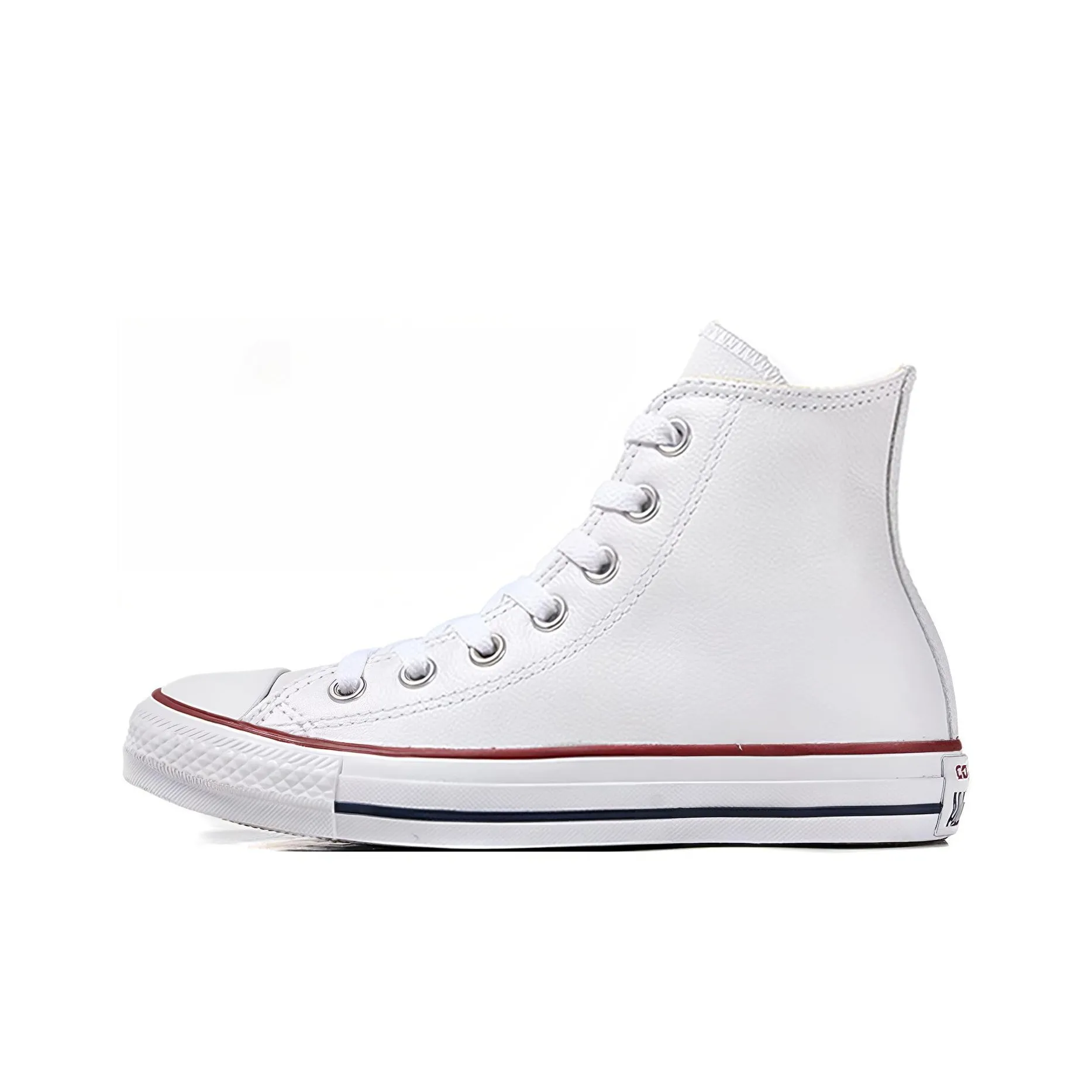 To identify the authenticity of the Chuck Taylor All Star Converse Leather Hi 'White', examine the stitching and overall finish. Authentic pairs have consistent stitching with no loose threads, and the leather should feel supple yet sturdy. The iconic star logo should be clear and well-defined, with no fading or misalignment. The sole should have a clean, uniform pattern, and the color should be a bright, true white without any discoloration.