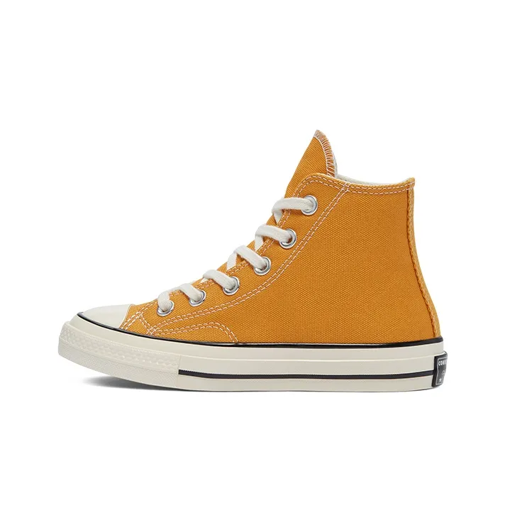 For the Converse Chuck Taylor All Star 70 Ox Sunflower GS, check the color and material quality. The yellow canvas should be bright and even, with no discoloration. The shoe's overall shape should be consistent with authentic models, and the sole should have a solid feel, indicating durability.