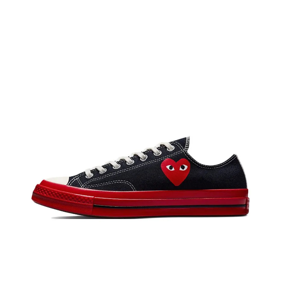 For the Chuck 70 Comme des Garçons Play x Converse Low 'Black Red', ensure the color contrast is sharp and the heart logo is correctly placed. The canvas should feel robust, and the overall design should be consistent with authentic models. Any discrepancies may indicate a counterfeit.