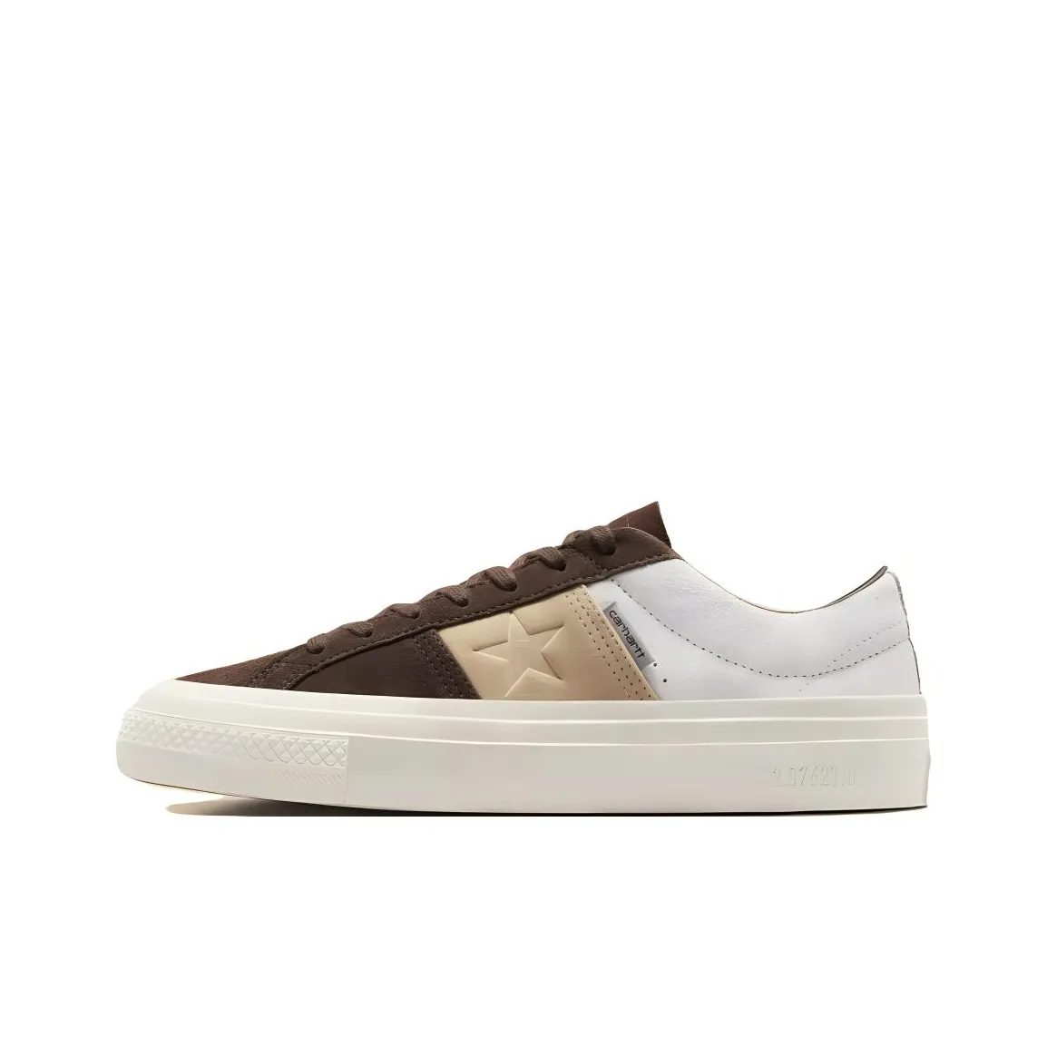 When assessing the One Star Carhartt Wip x Converse Academy Pro Low 'Starfish Dark Earth', look for the unique brown/tan cream colorway. Authentic pairs will have a well-defined rubber sole and a flat heel, with no signs of fading or wear.