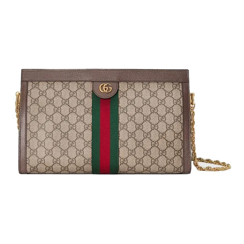 For the GUCCI Ophidia Canvas With Leather Chain Bag, inspect the overall quality. The canvas should be robust, and the leather should be supple. The dimensions should be accurate, and the bag should maintain its shape. The hardware should be heavy and feature the GUCCI logo, with no signs of tarnishing.