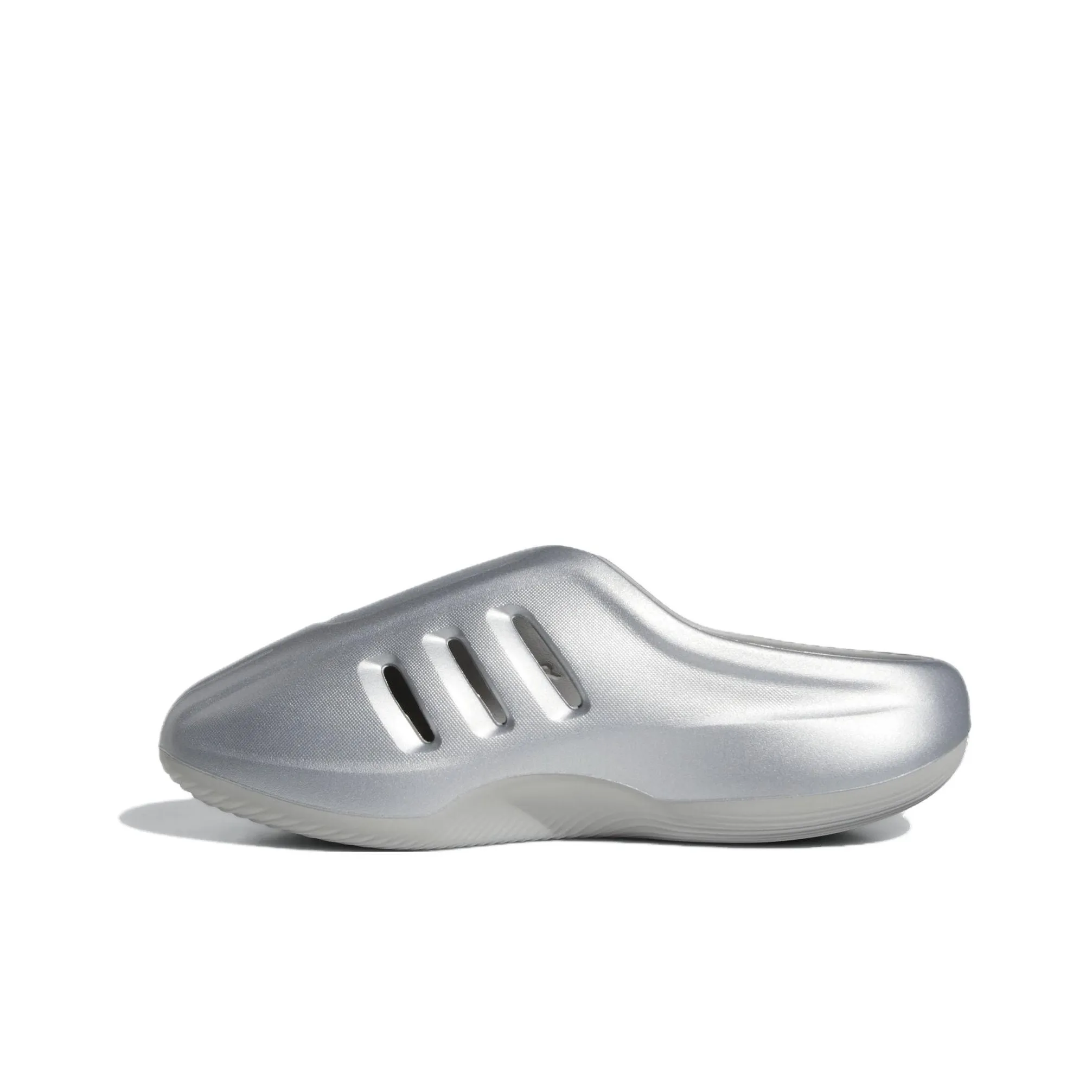For the Adidas adiFOM IIInfinity 'Silver Metallic', inspect the shoe's surface for any imperfections. Authentic pairs will have a smooth finish with no scuffs or scratches. The closed toe design should be uniform, and the platform heel should feel sturdy. The silver color should be consistent, with no discoloration or fading.