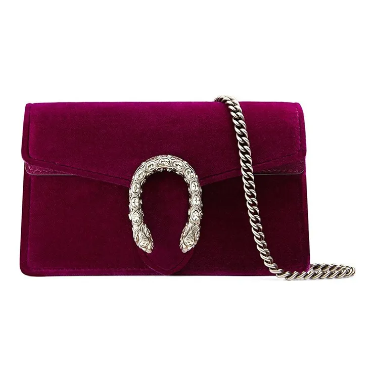 To verify the authenticity of the GUCCI Dionysus Shoulder Bag, examine the overall craftsmanship. The velour should feel luxurious, and the color should be vibrant without any inconsistencies. The snap closure should function smoothly, and the chain detailing should be robust and well-finished.