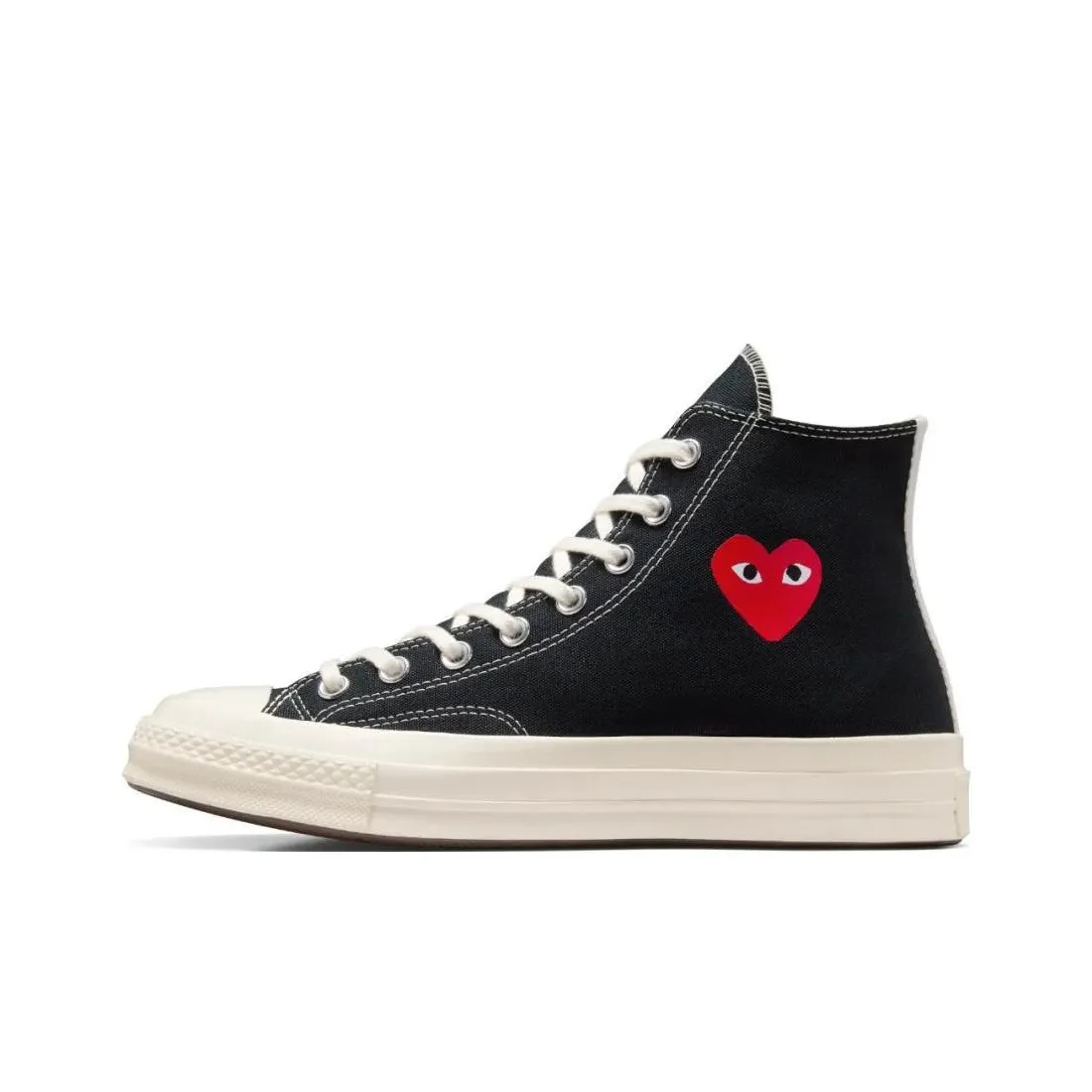 To verify the authenticity of the Chuck 70 Comme des Garçons Play x Converse High 'Single Heart - Black', look closely at the heart logo's placement and size. The stitching should be flawless, and the canvas should feel durable. Authentic pairs will have a consistent color and texture throughout, with no signs of wear or defects.