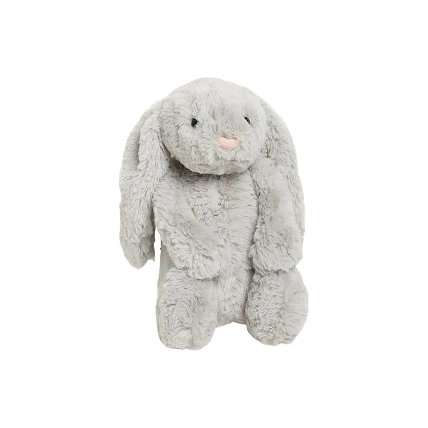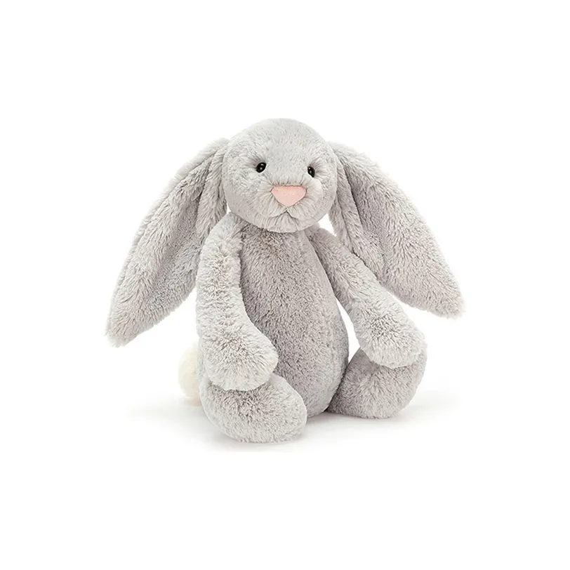For this Jellycat gray bunny plush toy, authenticity can be determined by examining its appearance. Genuine Jellycat bunnies are crafted with high-quality plush material, providing a soft and cuddly texture. The stitching should be neat and consistent, with no loose threads. The bunny's features, including its eyes and nose, should be well-defined and securely attached. The overall shape should be proportional, and the color should be a consistent gray without any fading.