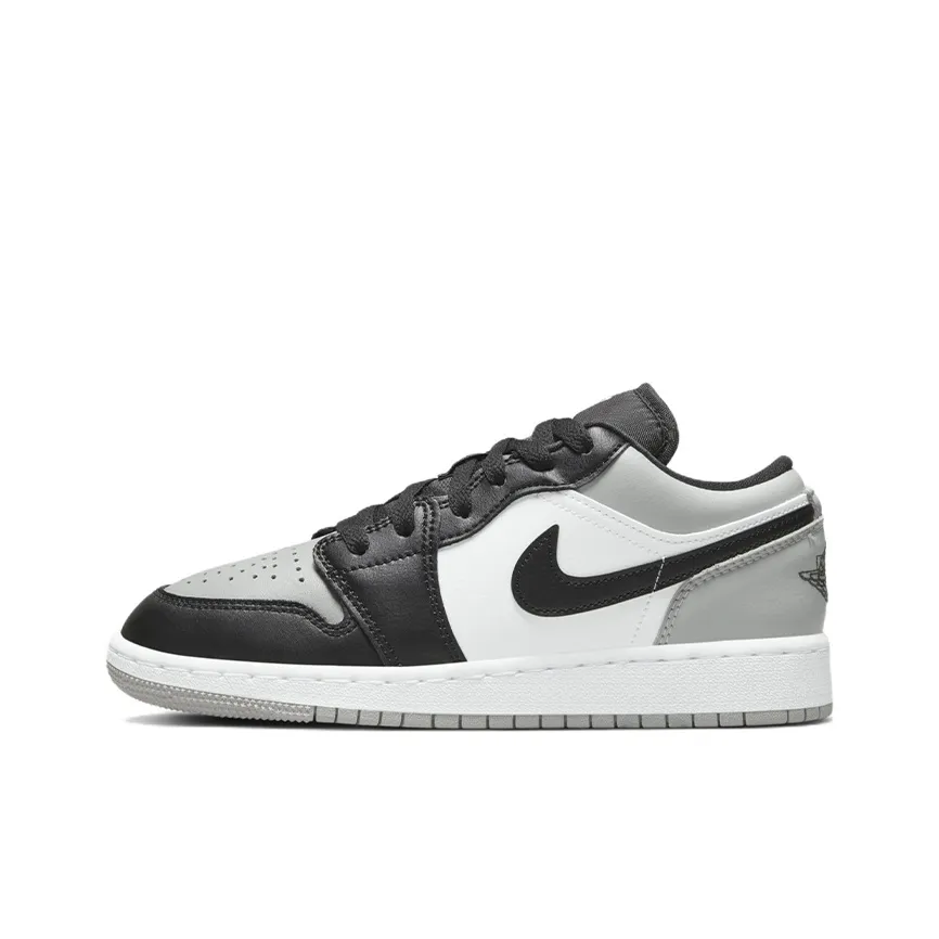 Authentic Jordan 1 Low Shadow Toe GS sneakers feature high-quality leather with a smooth finish. Inspect the color consistency and ensure that the black and gray shades are uniform. The sole should have a solid grip pattern, and the overall silhouette should match official images closely.