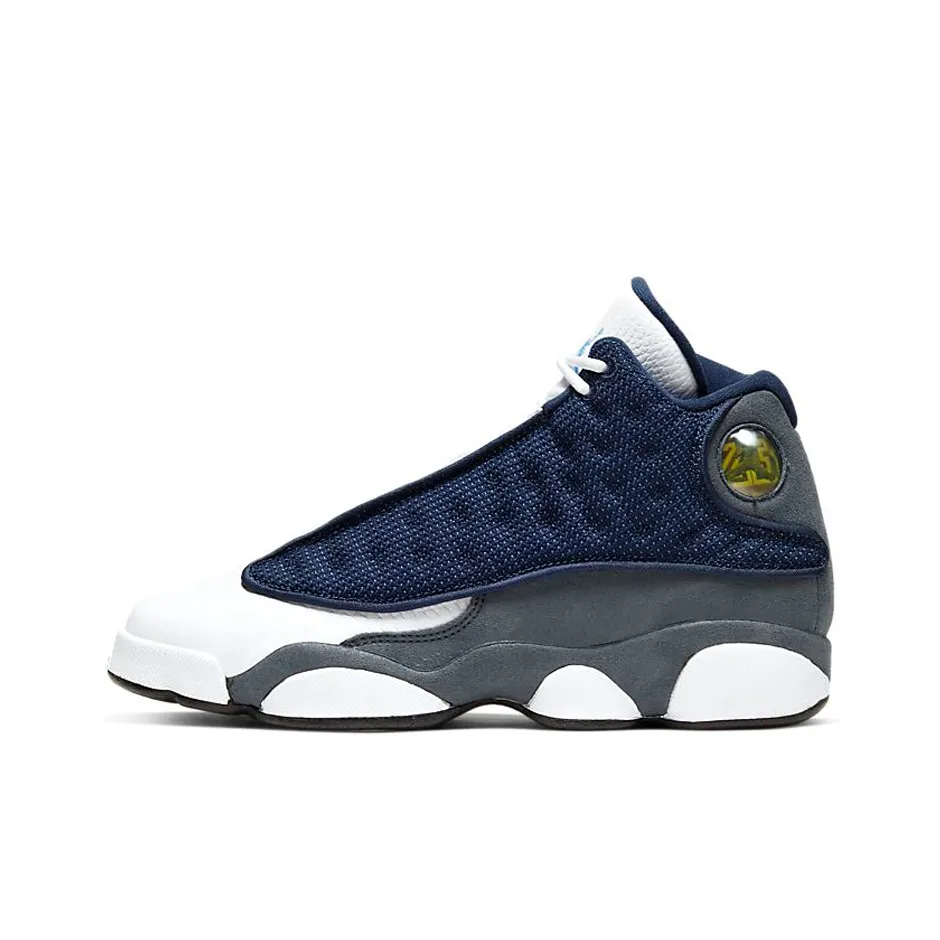 For the Air Jordan 13 Retro 'Blue Grey', check for a clean white color with grey accents. The stitching should be precise, and the overall construction must reflect the original design.