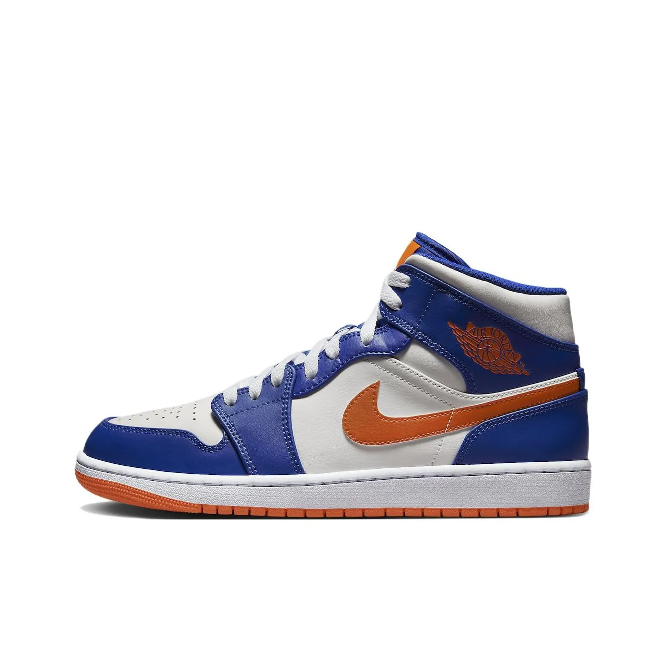To authenticate the Air Jordan 1 Mid 'Knicks', look for the quality of the leather and the precision of the color application. Genuine pairs have a consistent blue color and a well-formed mid-top structure.