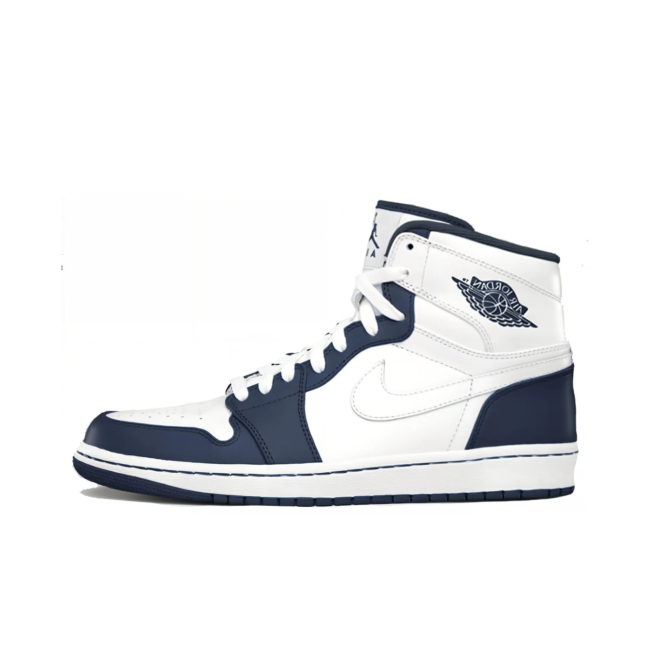 To verify the authenticity of the Jordan Air Jordan 1 Vintage Basketball Shoes Men High Top White/White/Midnight Blue, inspect the synthetic leather upper. Authentic pairs will have a smooth, high-quality finish with consistent color and texture. The rubber sole should have a defined tread pattern, and the overall construction should feel solid and well-crafted.