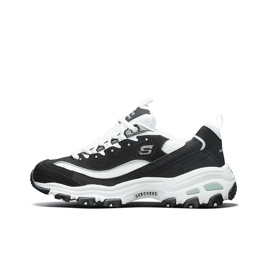 For the Skechers Dlites 1.0 'Black White' Women's shoes, examine the overall finish and materials. Authentic pairs will have a consistent color scheme and high-quality materials. The sole should be sturdy, and the logo should be prominently displayed without any smudging.