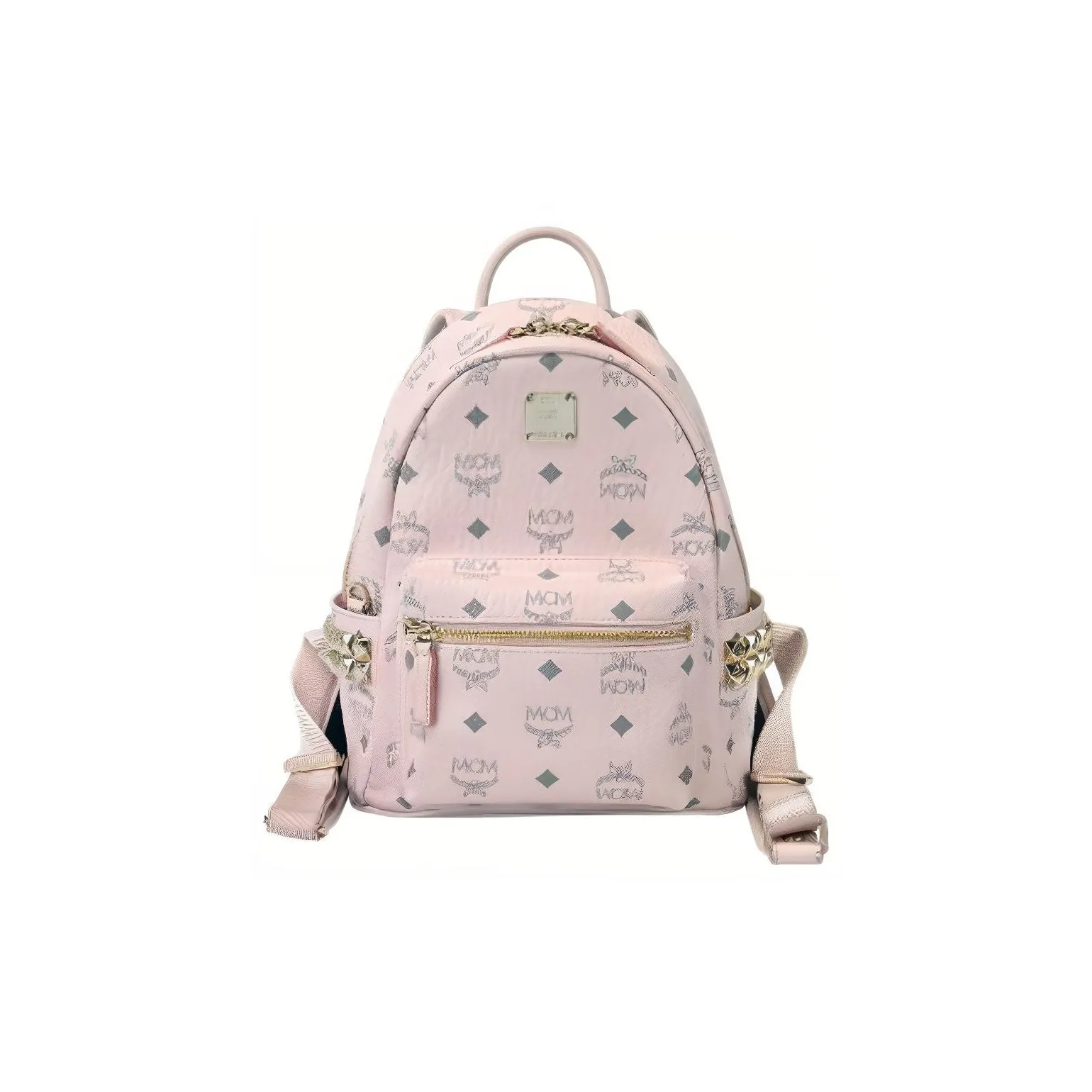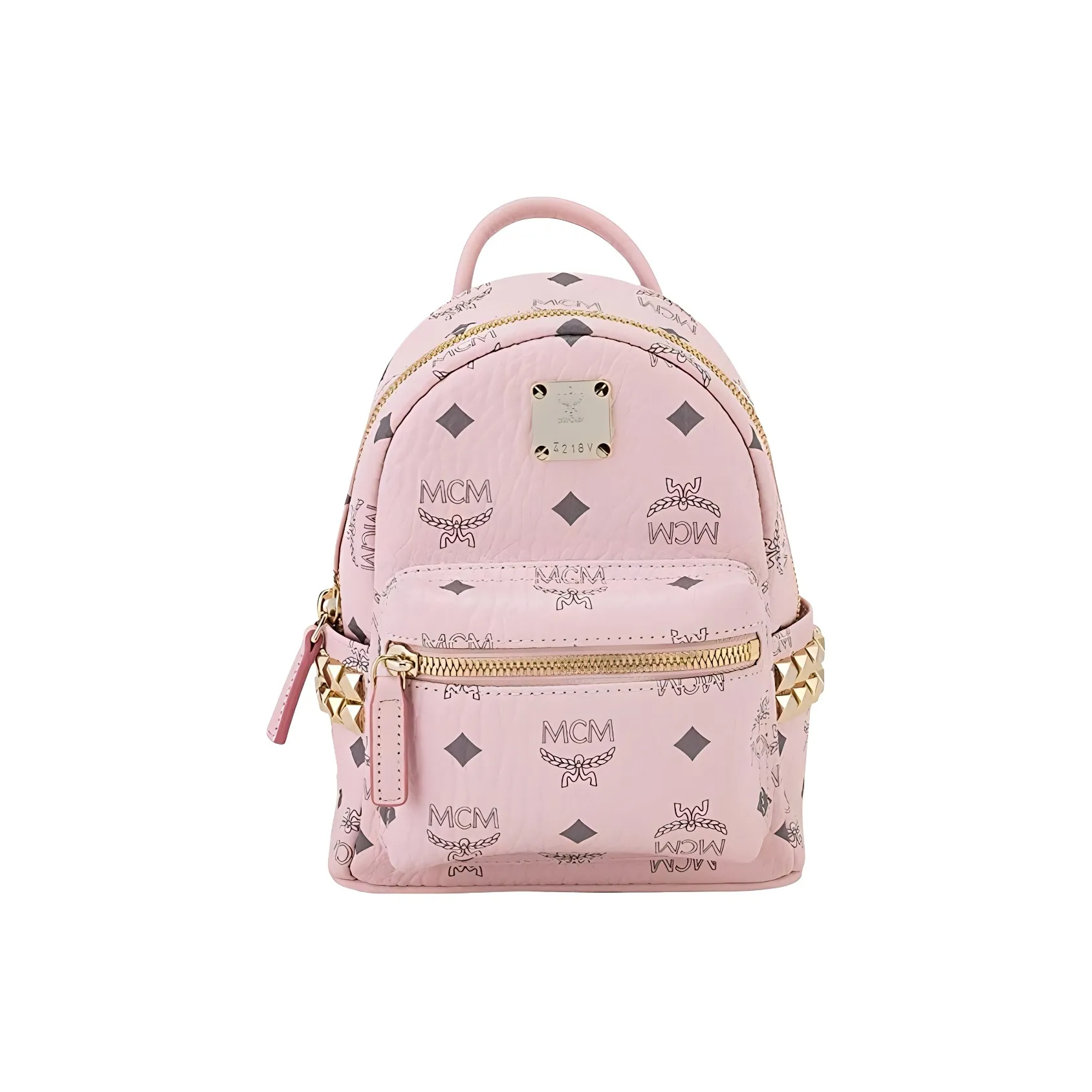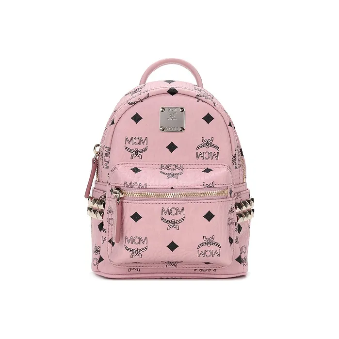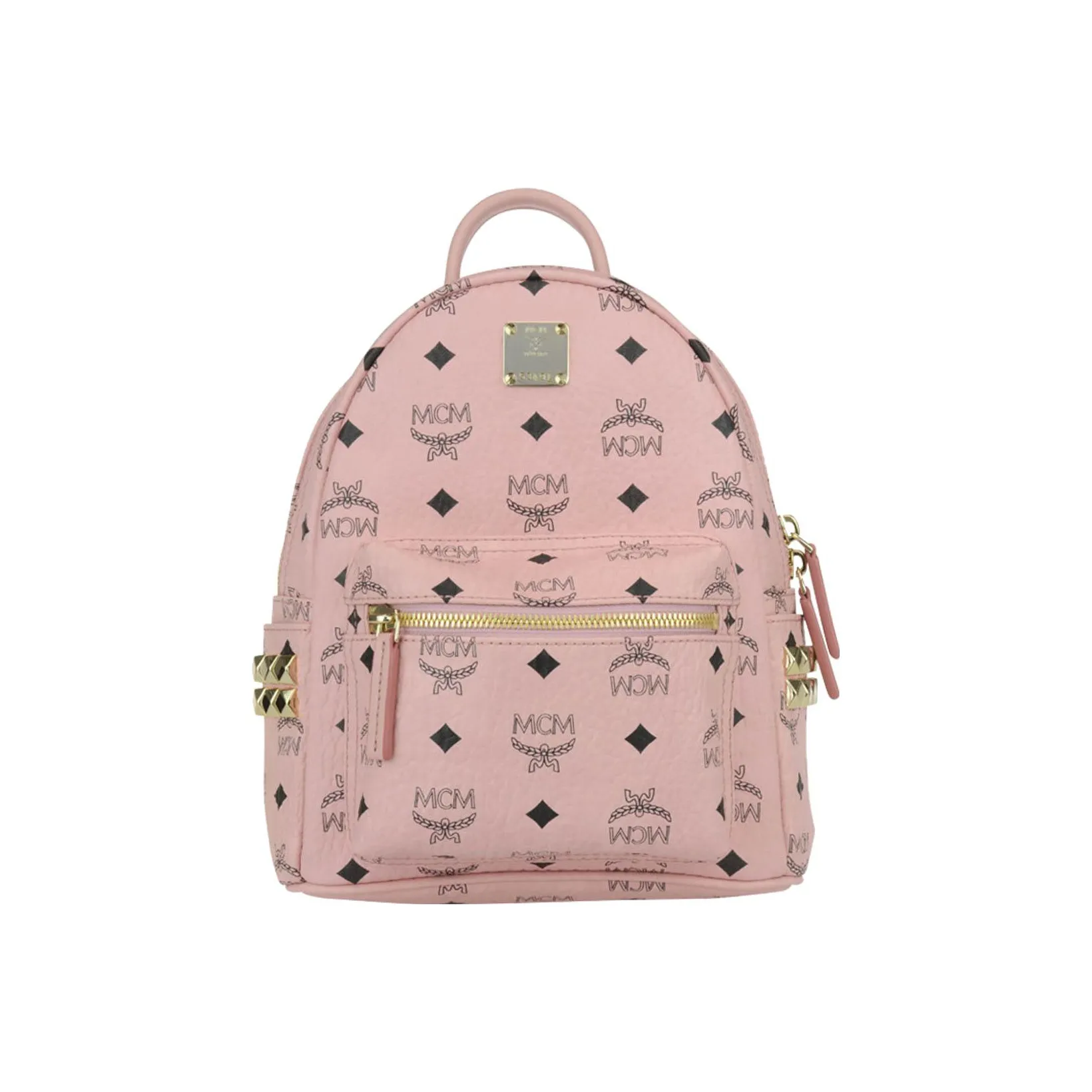 When assessing the authenticity of this MCM backpack, focus on the leather texture and color. The pink leather should be soft and supple, with a consistent hue. Look for any signs of wear or damage, as authentic bags maintain their quality over time. The studs and prints should be perfectly aligned and securely attached.
