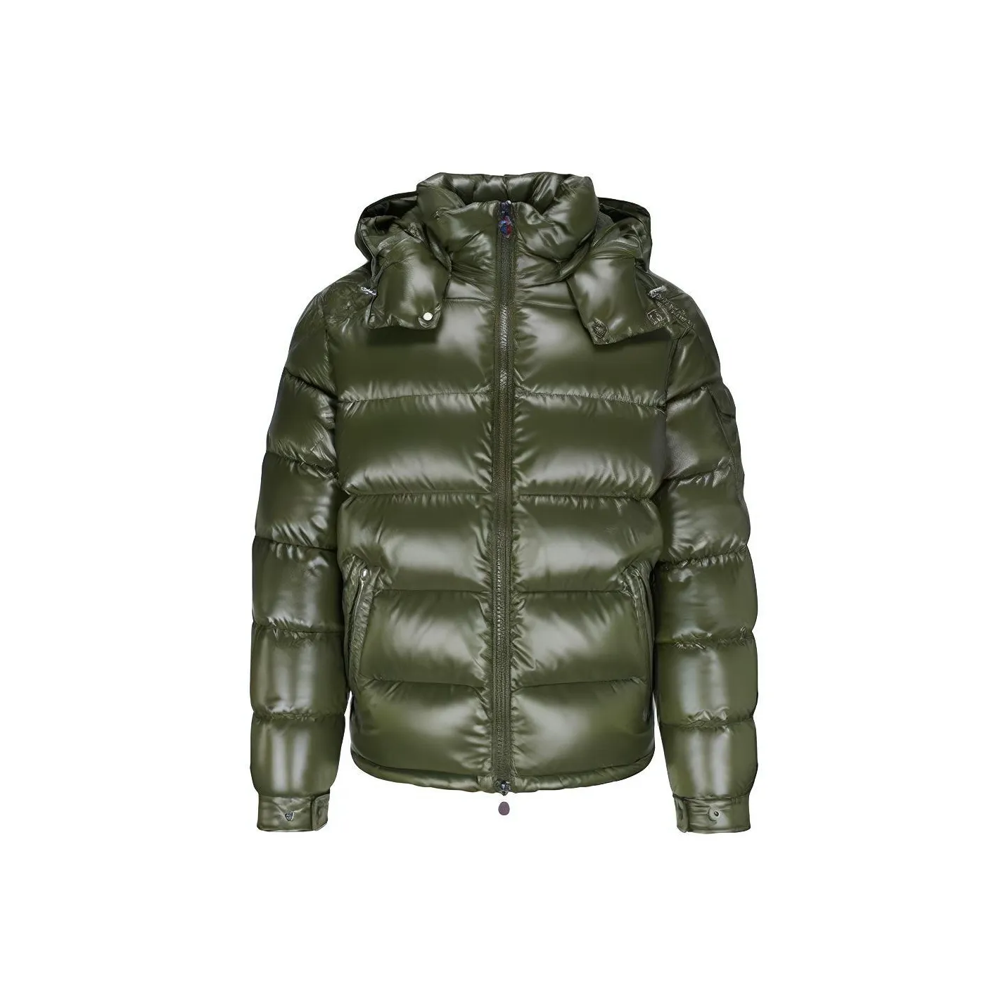 To verify the Army Green Moncler Maya jacket, examine the fabric and stitching. Authentic jackets are made from 100% polyamide, ensuring a smooth texture. The stitching should be flawless, with no loose threads or uneven seams.