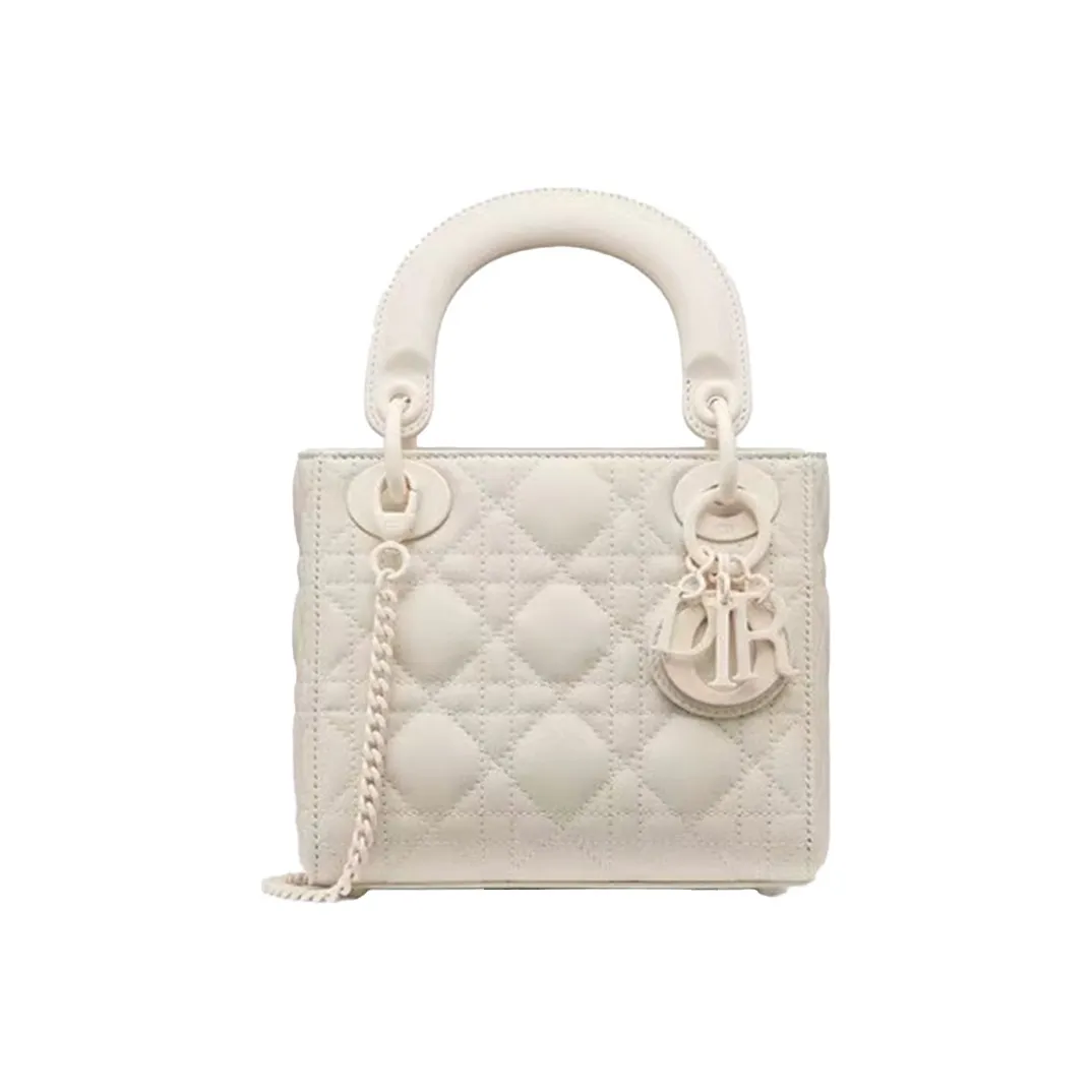 To verify the authenticity of this DIOR Lady DIOR Handbag, inspect the materials and craftsmanship. The cow leather should be soft and durable, with a consistent texture. The internal zip pocket should be functional and well-constructed, with smooth zippers. The diamond pattern must be precise, and the milk white color should be uniform without any discoloration. Ensure that the bag's dimensions align with the specified measurements.