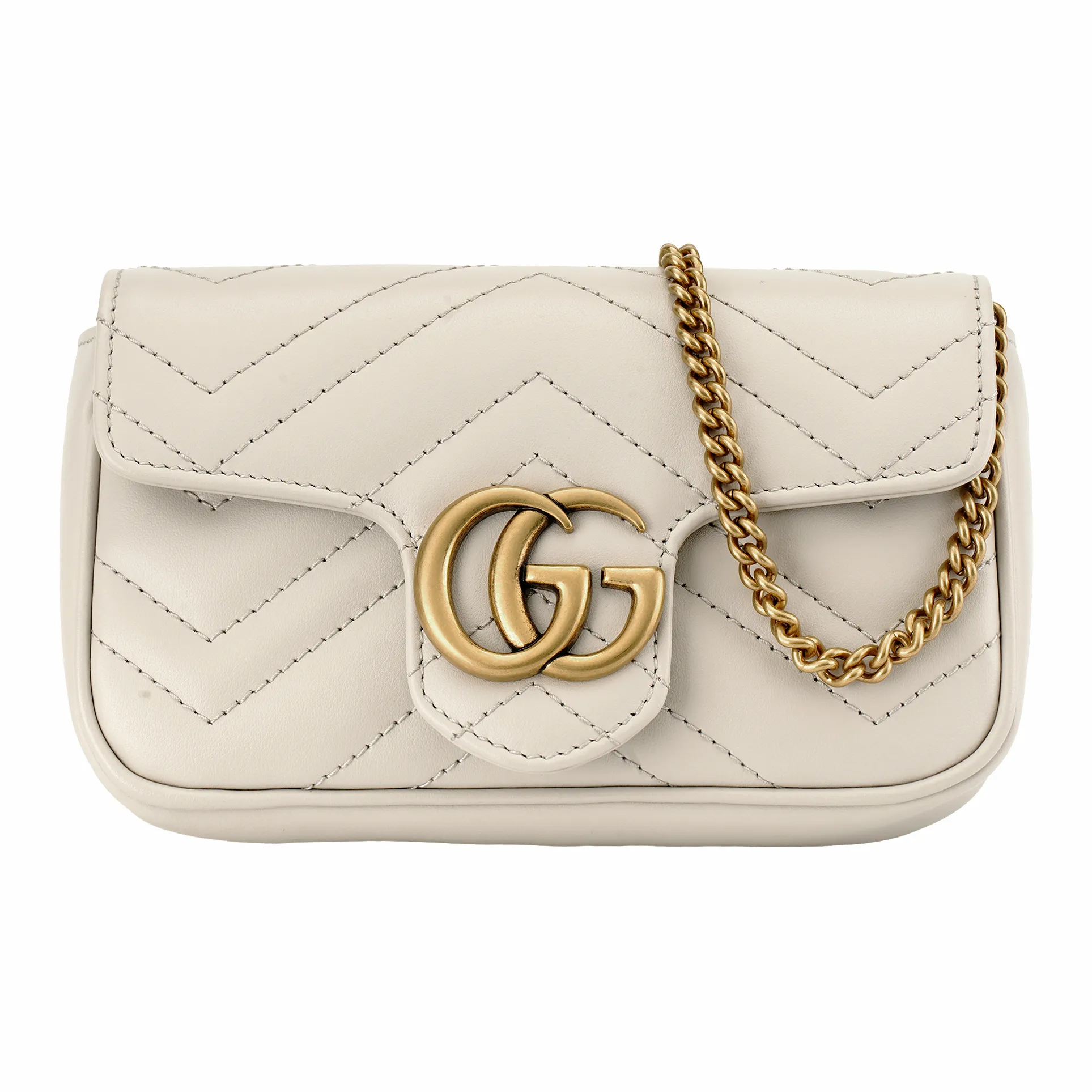 To verify the authenticity of the GUCCI GG Marmont Matelasse Super Mini Bag, examine the stitching and the quilted pattern. Authentic bags feature precise, even stitching with no loose threads. The iconic GG logo should be embossed clearly and symmetrically on the front. Additionally, the leather should feel soft yet durable, with a luxurious sheen that indicates high-quality craftsmanship.