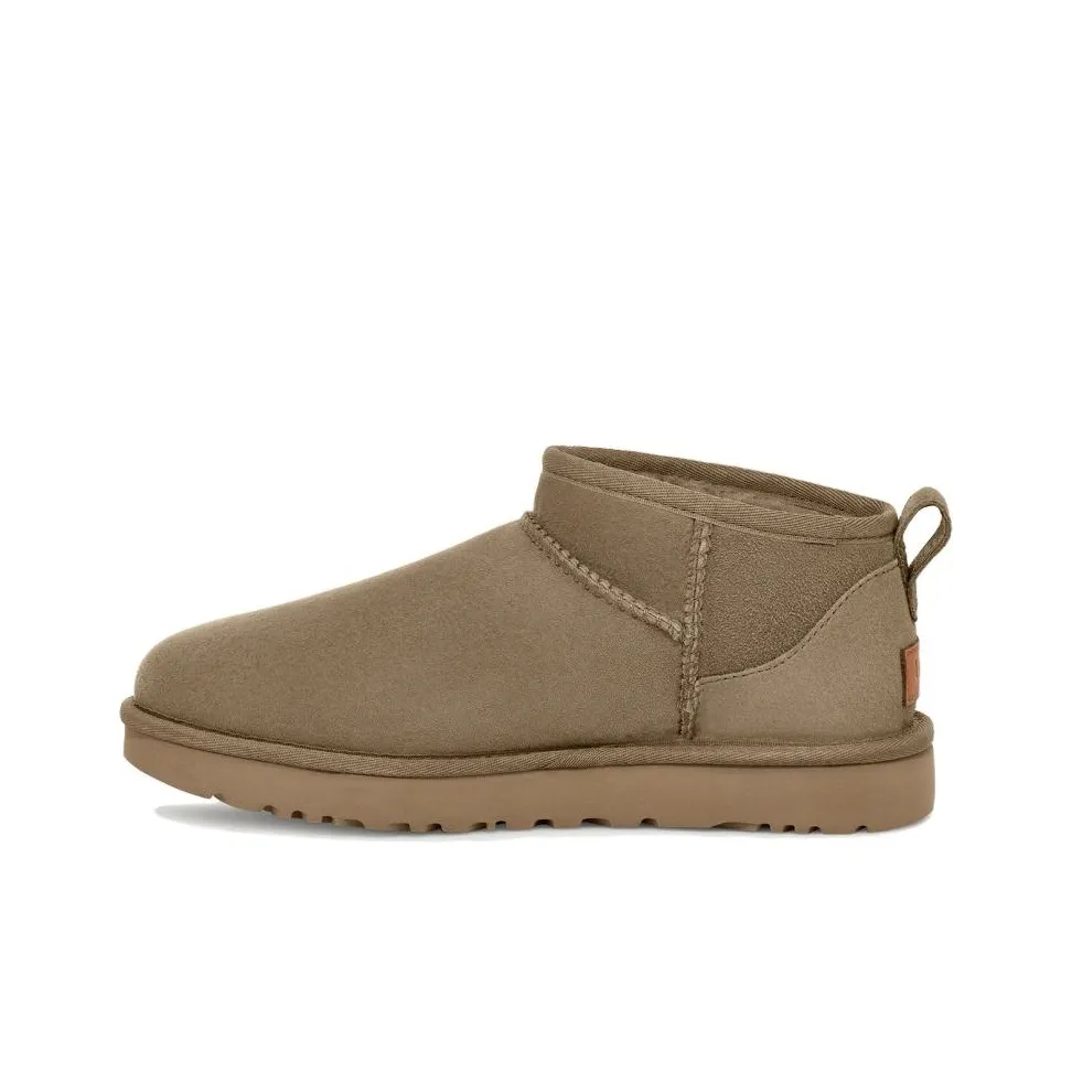 The UGG Classic Ultra Mini 'Antilope' Women's boots should have a soft suede upper with a rounded toe and flat heel. The fleece lining should be plush and warm. Inspect the overall shape and structure to ensure it matches the original design.