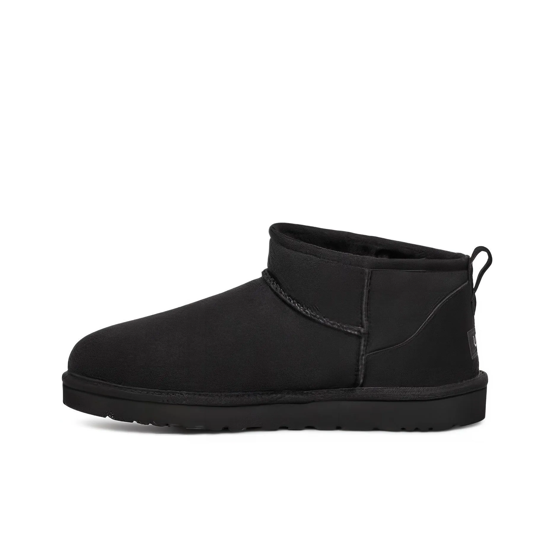 The UGG Classic Ultra Mini 'Black' Women's boots should have a soft suede exterior with a rounded toe and a flat heel. The fleece lining should be thick and cozy, providing warmth. Inspect the overall craftsmanship for any irregularities that may suggest a counterfeit.