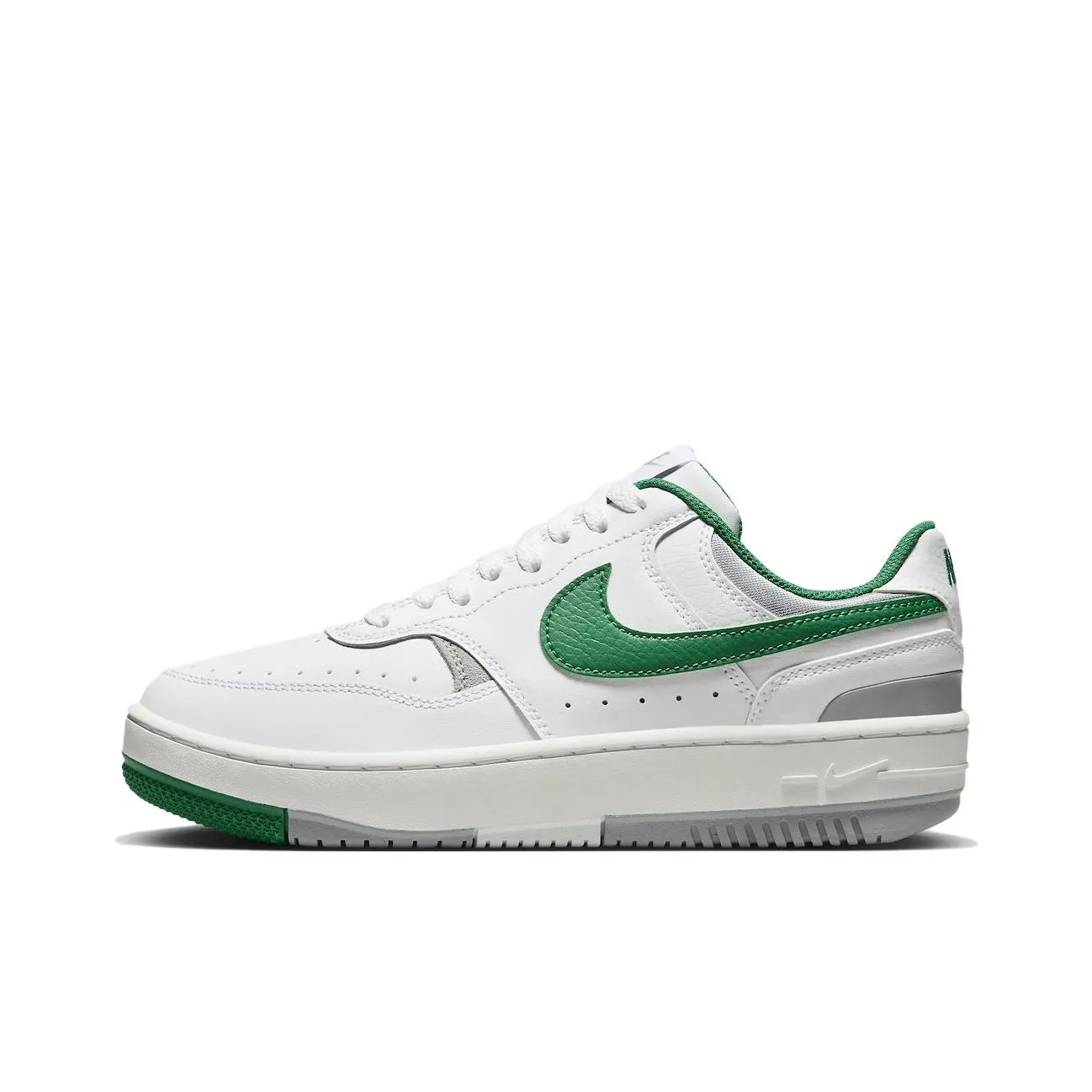 Verify premium leather quality across the white upper, with green overlays displaying consistent dye saturation and smooth edges; creasing patterns should be natural. Examine stitch density and seam alignment, ensuring no loose threads or excess adhesive. Midsole contour and outsole traction pattern must align with authentic references; insoles and internal padding feel uniform and factory-assembled without aftermarket modification evident now.