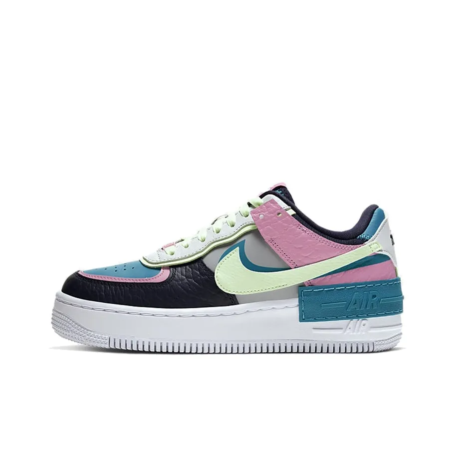 For the Nike Air Force 1 Low Shadow Barely Volt Oracle Aqua Women's, check the color scheme and material quality. Authentic pairs will have a vibrant pink and green colorway, with the synthetic leather feeling soft yet durable. The overall shape should be consistent with Nike's design standards.