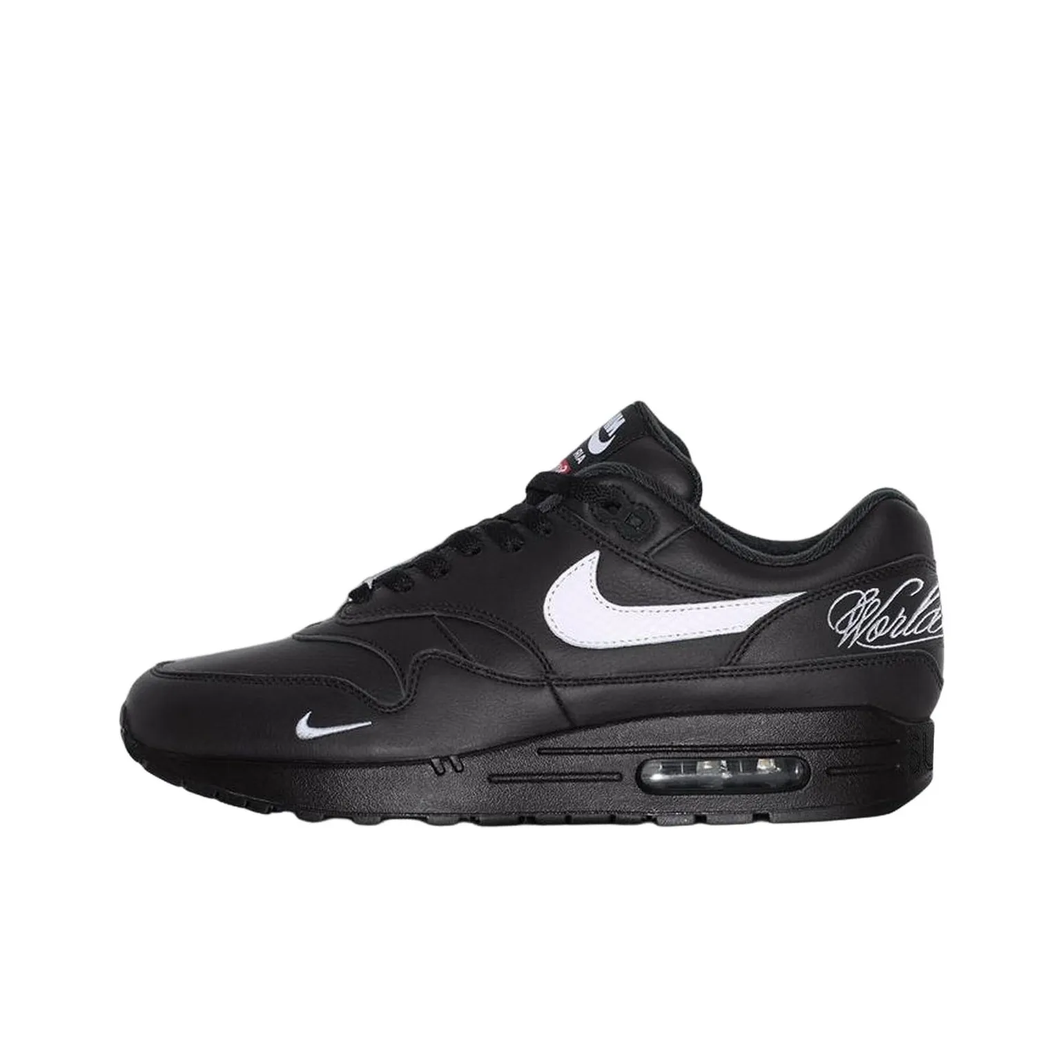 For the Nike Air Max 1 '87 Sp Supreme Black White, observe the leather quality. Authentic pairs have a smooth, high-quality finish. The overall design should match official images, with no discrepancies in color or shape.
