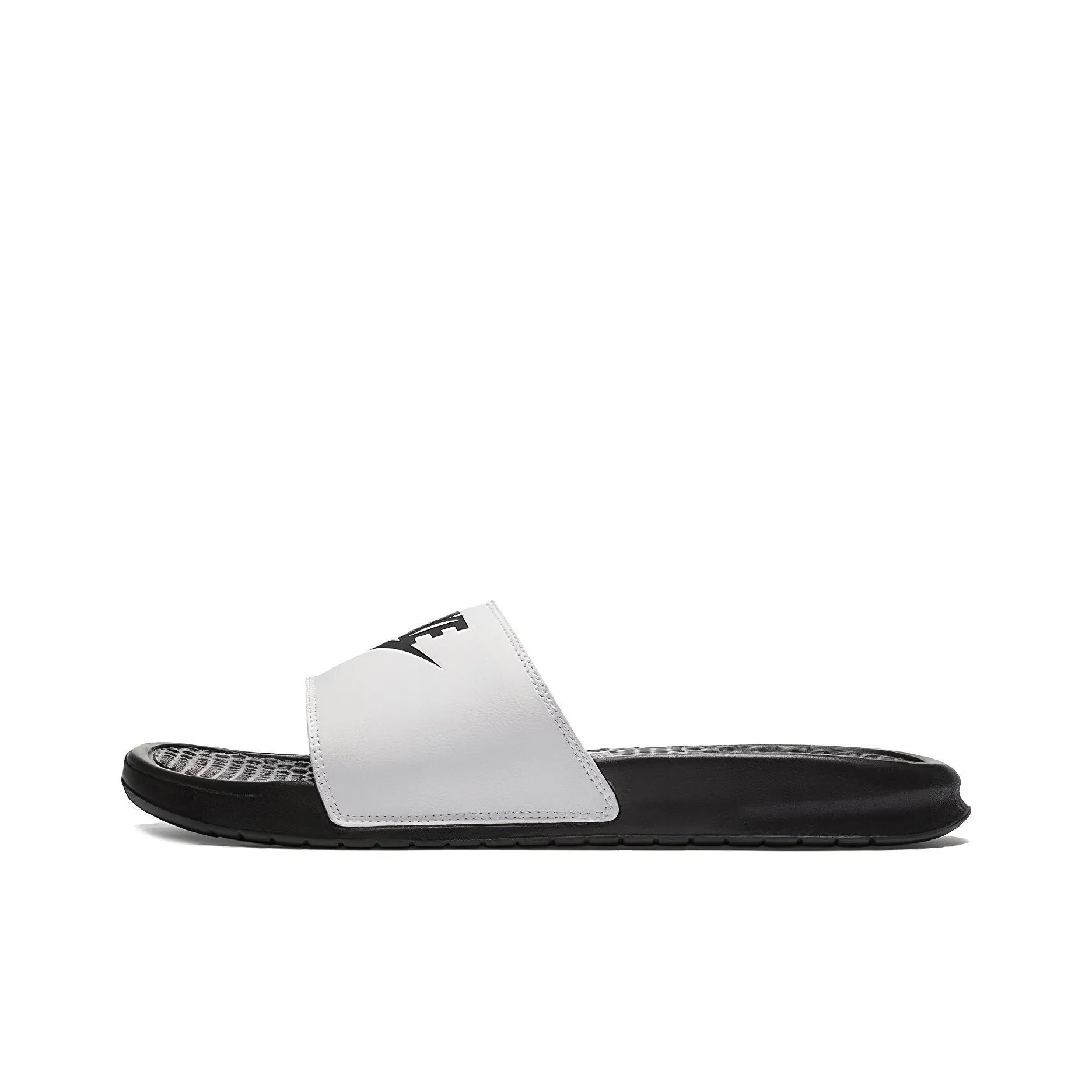For the Nike Benassi 'Just Do It', inspect the overall design for quality. The upper should be made of EVA and synthetic leather, feeling smooth and sturdy. The logo should be bold and clear, with no signs of peeling or fading.
