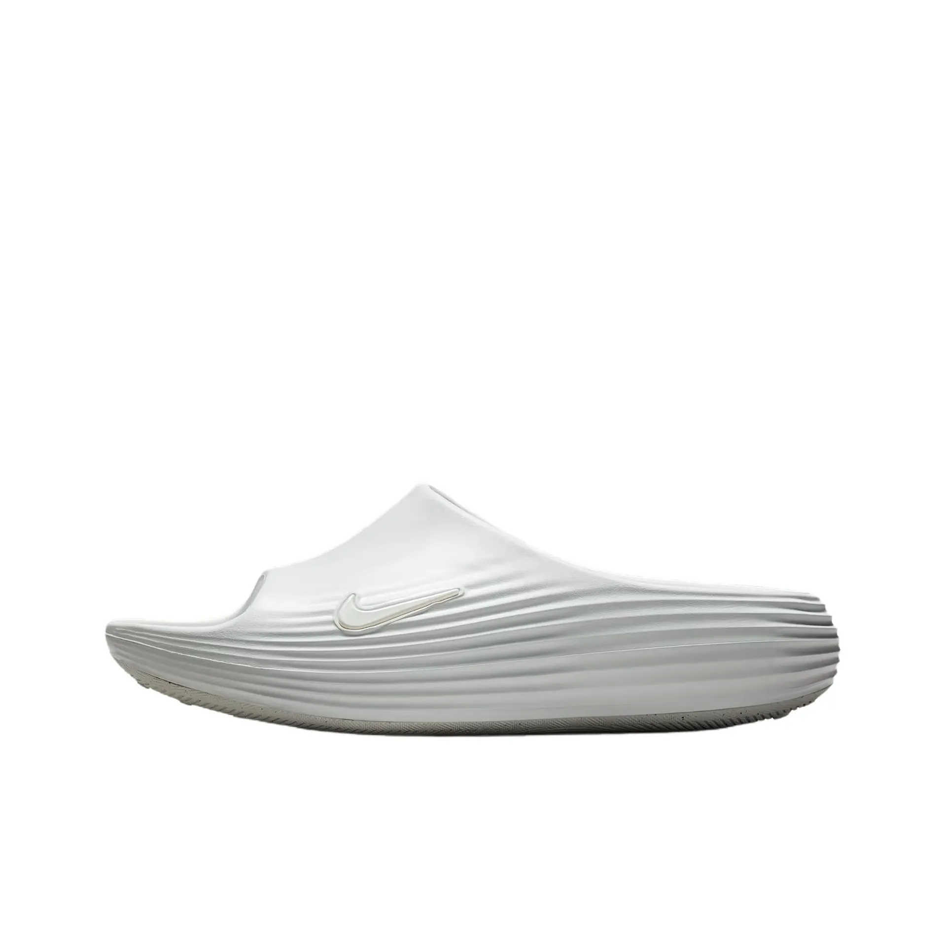 For the Nike ReactX Rejuven8 Slide Summit White, inspect the overall design for consistency. The color should be a bright, clean white without discoloration. The sole should have a slip-resistant texture, and the logo must be prominently displayed without any smudging or irregularities.