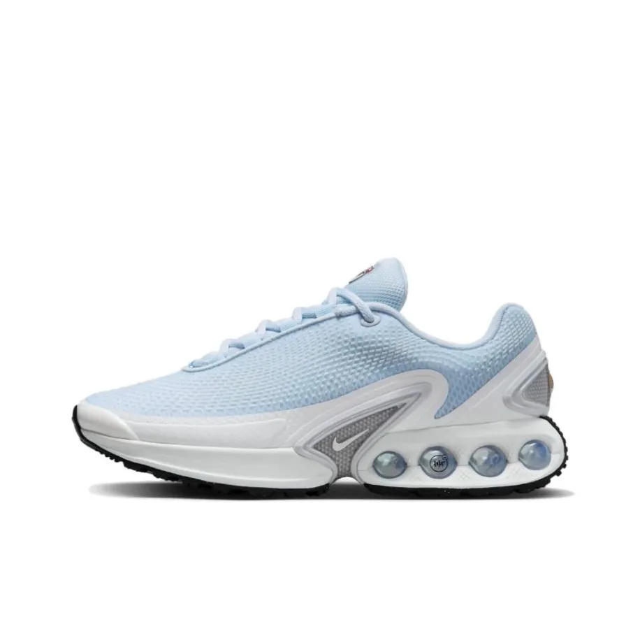 The Nike Air Max Dn Half Blue Women's shoes should showcase a stylish blue upper with a round toe style. Authentic pairs feature a flat heel and a lace-up closure that feels secure and well-constructed.