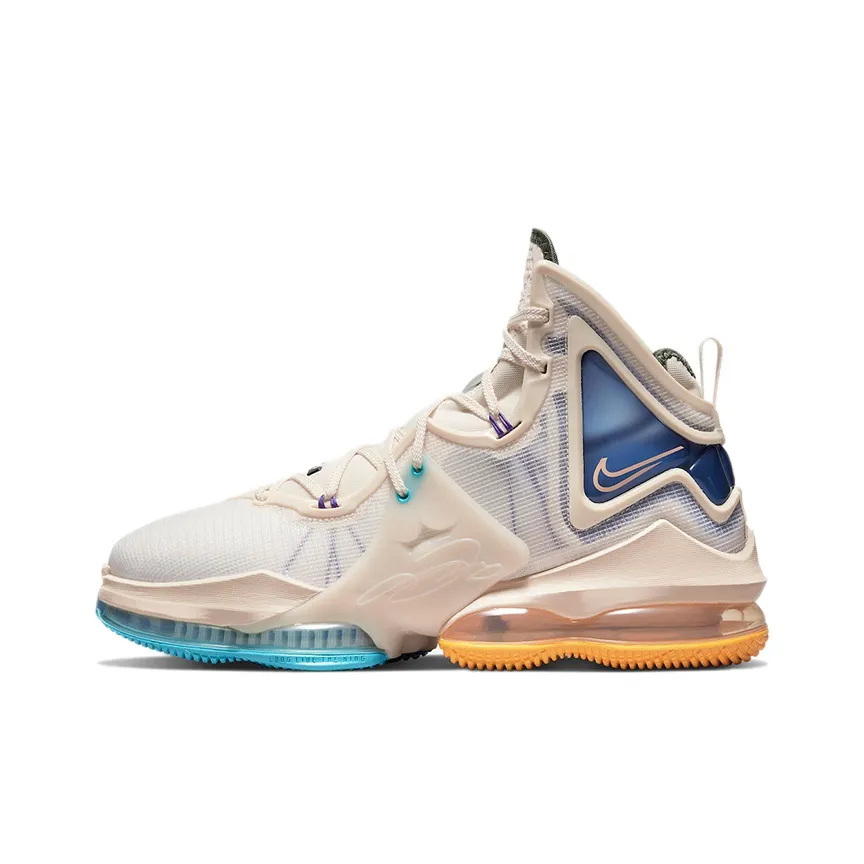 To authenticate the Nike LeBron 19 Ep 'MPLS Lakers', inspect the shoe's beige color and the ecru/blue/yellow color scheme. Authentic shoes will have a consistent color application with no uneven patches. The materials should feel premium, and the stitching should be flawless. The round tip design should be uniform, and the overall construction should reflect high-quality craftsmanship.