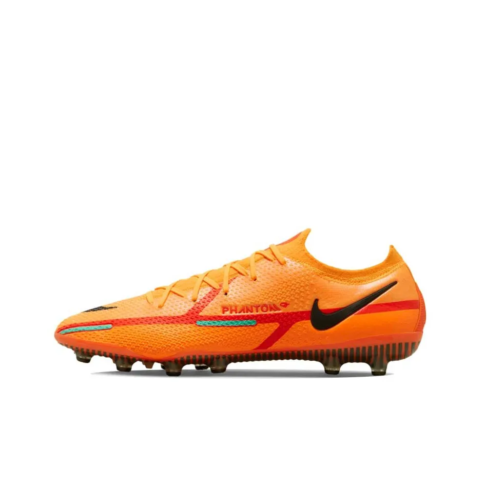 For the Nike Phantom GT2 Elite AG Pro 'Blueprint Pack', inspect the vibrant laser orange color. Authentic pairs will have a consistent color with no fading or discoloration. The stitching should be tight and even, and the overall construction should feel solid. The toe style should be round and well-defined.