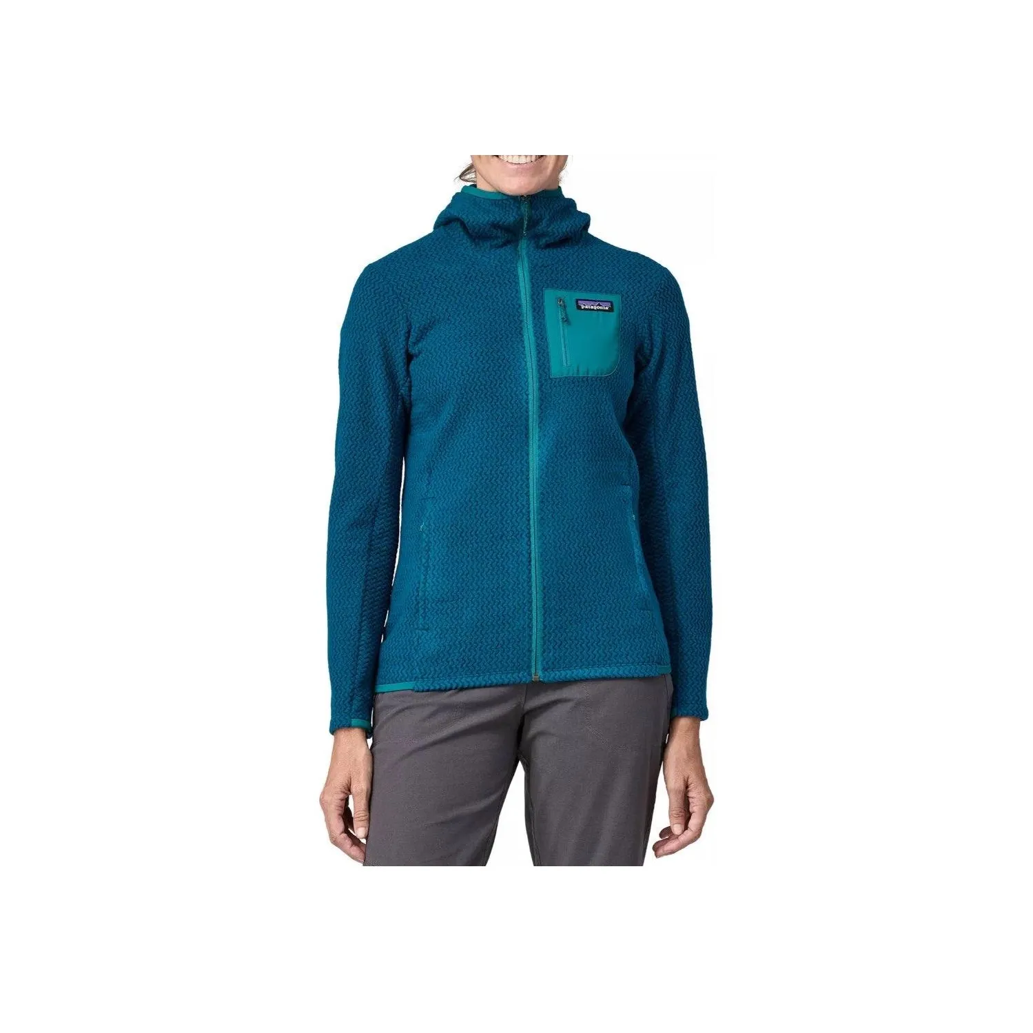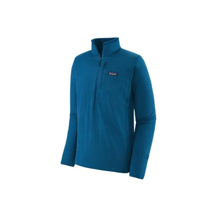Authentic Patagonia R1 jackets feature a clean, solid color design with a well-stitched logo patch. The fabric should feel durable yet soft, with no loose threads or irregularities. Check for consistent color and texture throughout the jacket, as genuine products maintain high-quality standards.