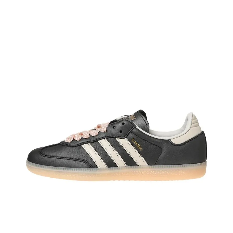 To verify the authenticity of the Adidas Samba Og Black Pink Ribbon Laces Women's, inspect the shoe's overall appearance. Authentic pairs will have high-quality leather with a matte finish, and the color scheme of Black, Beige, and Pink should be vibrant and consistent. The stitching should be even, and the sole should have a clear Adidas logo.