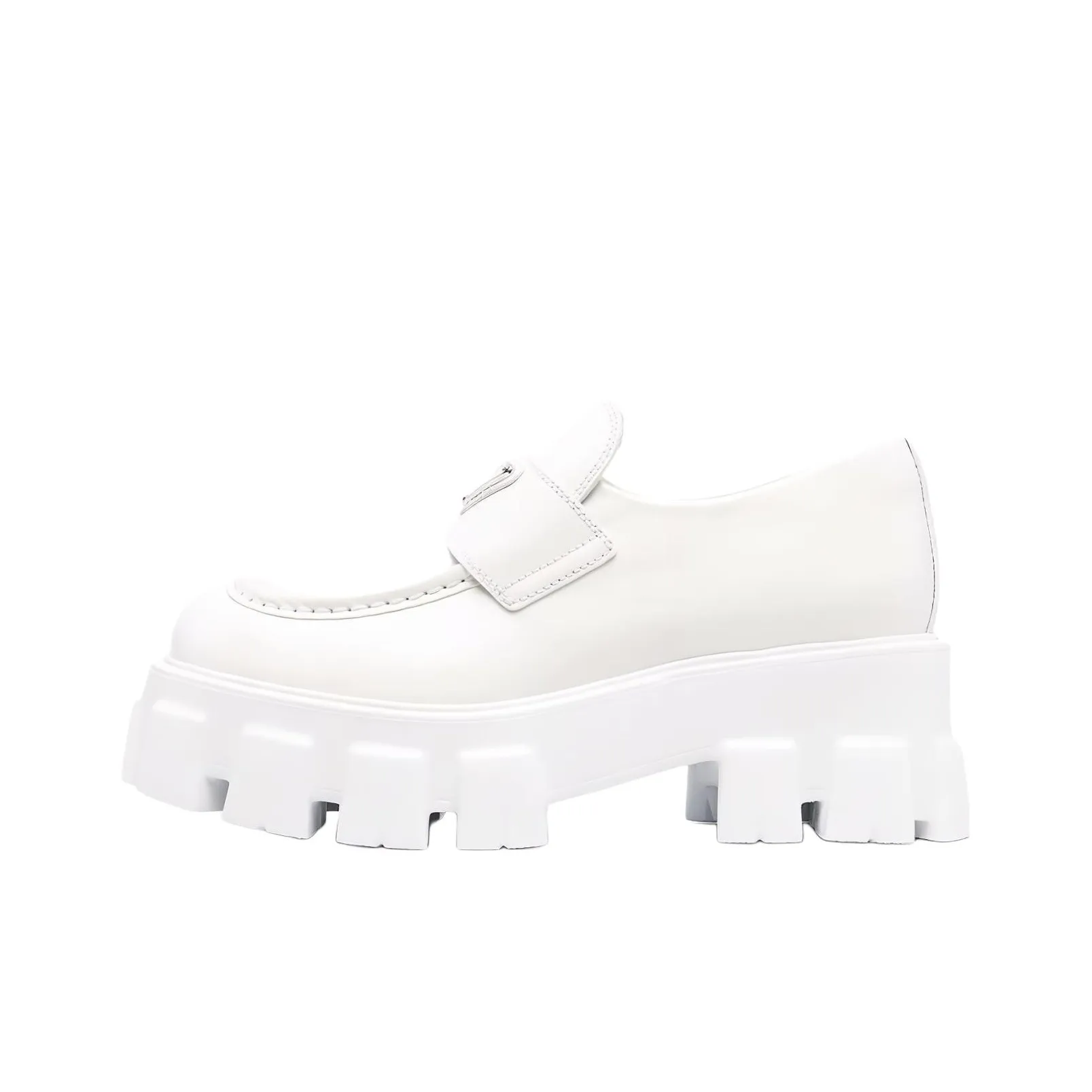 The PRADA Brushed Leather Monolith Loafers in white are distinguished by their pristine finish and luxurious feel. The leather should be smooth and free from blemishes. Authentic pairs will have a well-defined shape and a consistent color, showcasing the brand's high standards.
