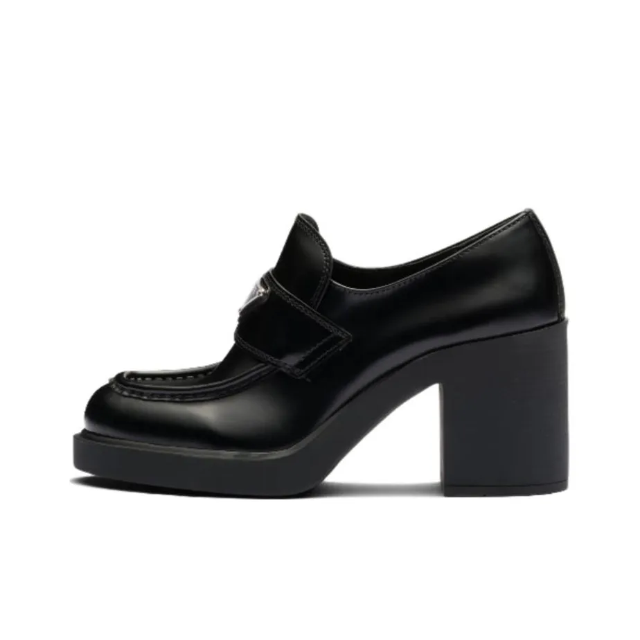 PRADA Chocolate High Heeled 85mm Loafers Black Brushed Leather Women's