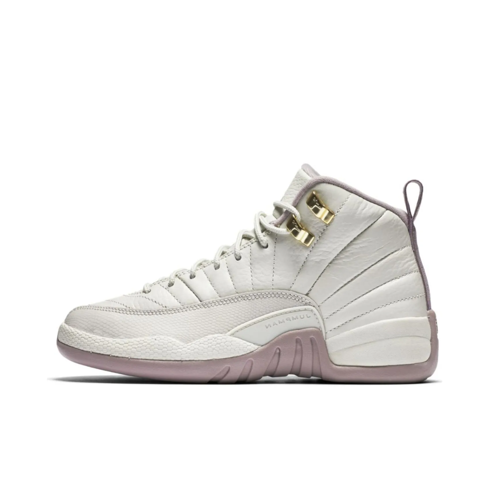 To identify the authenticity of the Jordan 12 Retro Heiress Plum Fog GS, examine the overall craftsmanship. Authentic pairs will have precise stitching, with no loose threads or uneven seams. The color scheme should match the official release, featuring Light Bone, Metal Gold, and Plum Blossom Mist. The leather should feel premium and supple, not cheap or plastic-like.