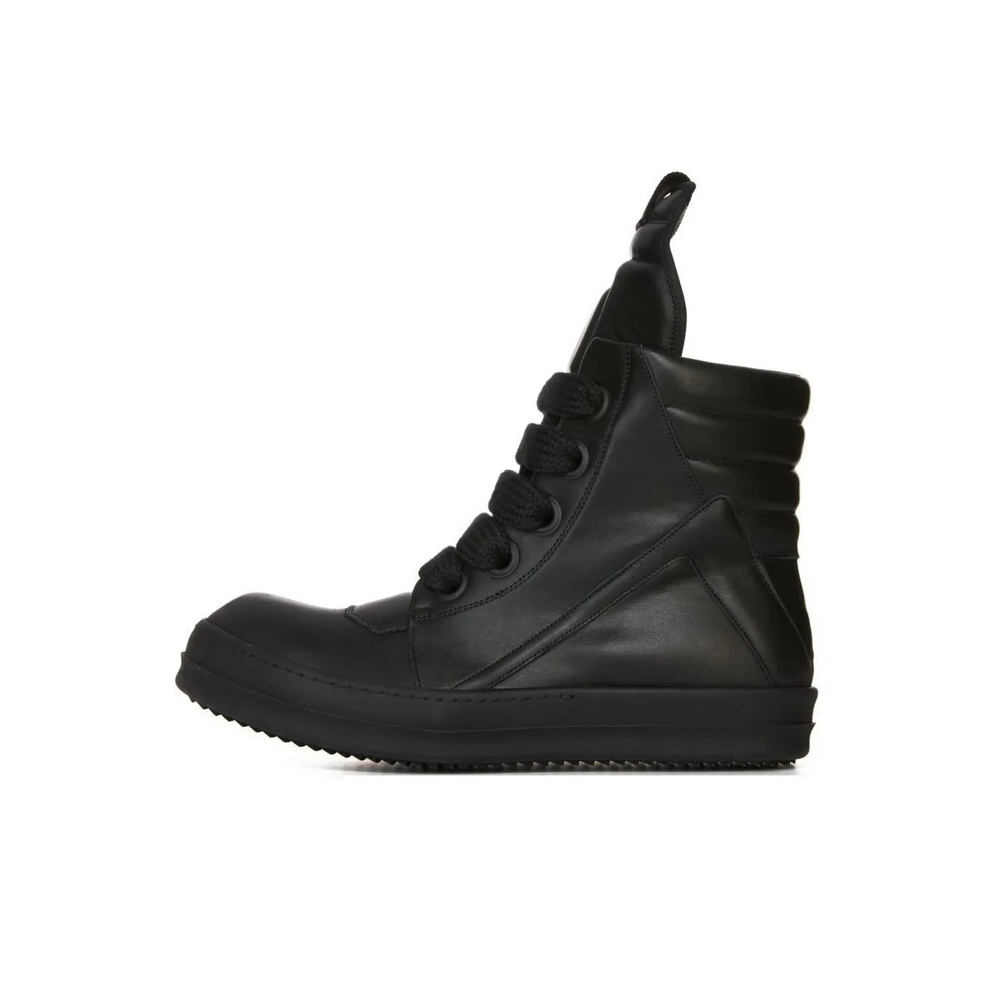 Inspect the silhouette and construction: Rick Owens Geobaskets show an oversized bulbous toe, thick exaggerated midsole, layered leather panels with raw edge finishes, consistent heavy stitch lines, solid eyelet placement, and balanced asymmetry. Authentic pieces have substantial weight, premium cow leather grain, perfectly aligned soles without glue seepage, and tonal aging specific to production season and craftsmanship details always visible.