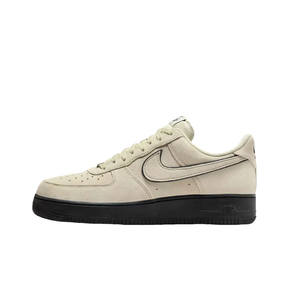 For the Nike Air Force 1 '07 LV8 Light Khaki Black, inspect the suede upper for quality. Authentic pairs will have a soft, premium feel, and the color should be uniform without any patches or inconsistencies. The sole should also be well-formed, with no signs of glue excess or misalignment.
