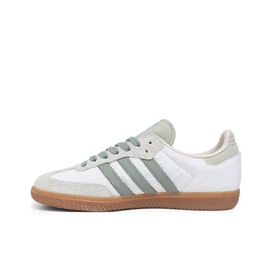 To identify the authenticity of the adidas Samba OG Silver Green Putty Mauve Women's shoes, examine the overall appearance. Authentic pairs will have a consistent color scheme, with the white and green hues appearing vibrant and well-defined. The stitching should be even and tight, with no loose threads or irregularities. Additionally, check the logo placement; it should be centered and clear, without any smudging or misalignment.