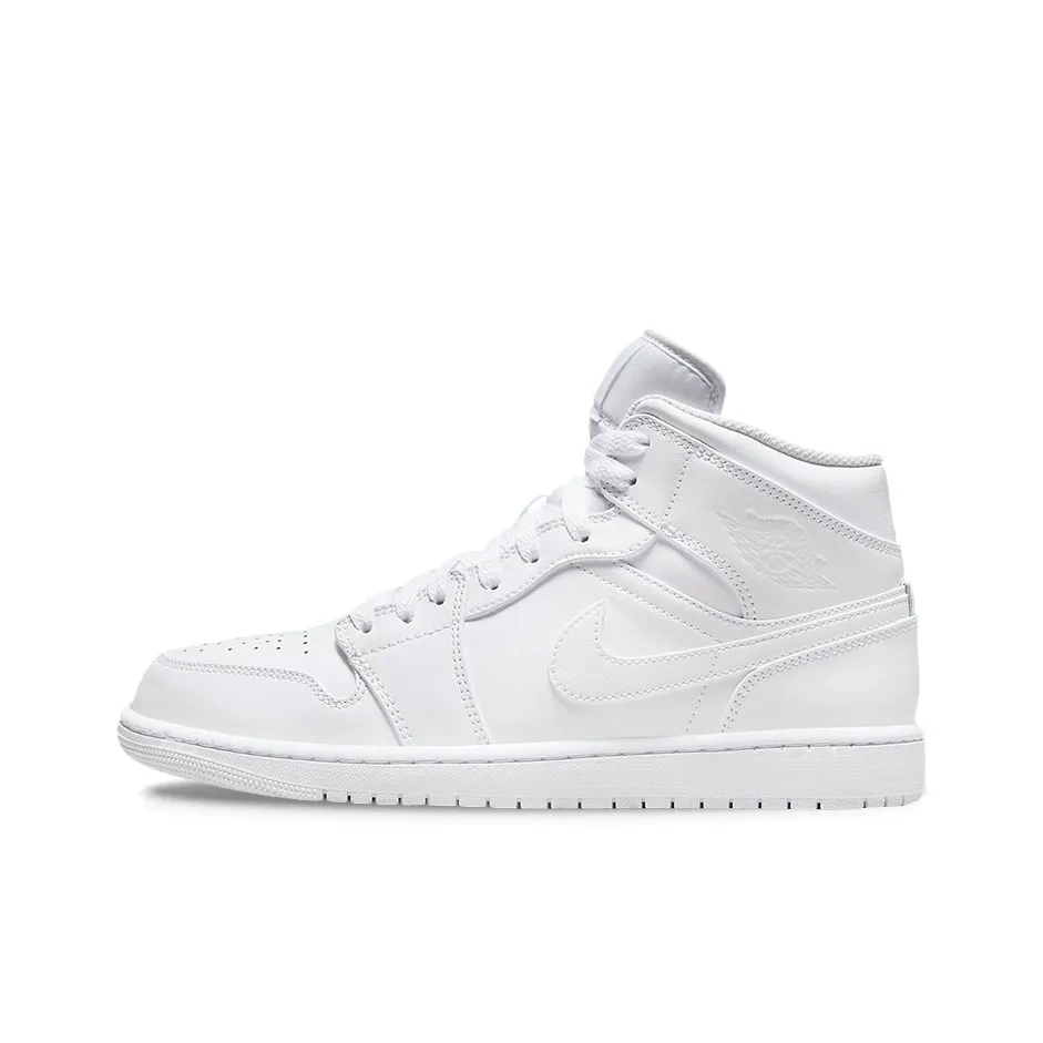 To verify the Air Jordan 1 Mid 'Triple White' 2022, examine the leather upper for quality. Authentic pairs will have a bright white color and a smooth finish. The stitching should be tight and consistent, with no loose threads. The overall shape should reflect the mid-top style accurately.