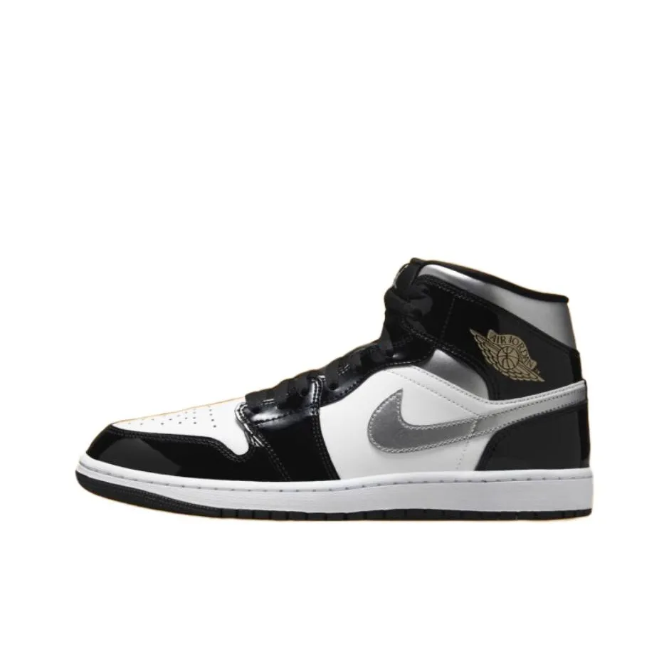 Jordan 1 Mid Se Patent Black White Metallic Silver Metallic Gold