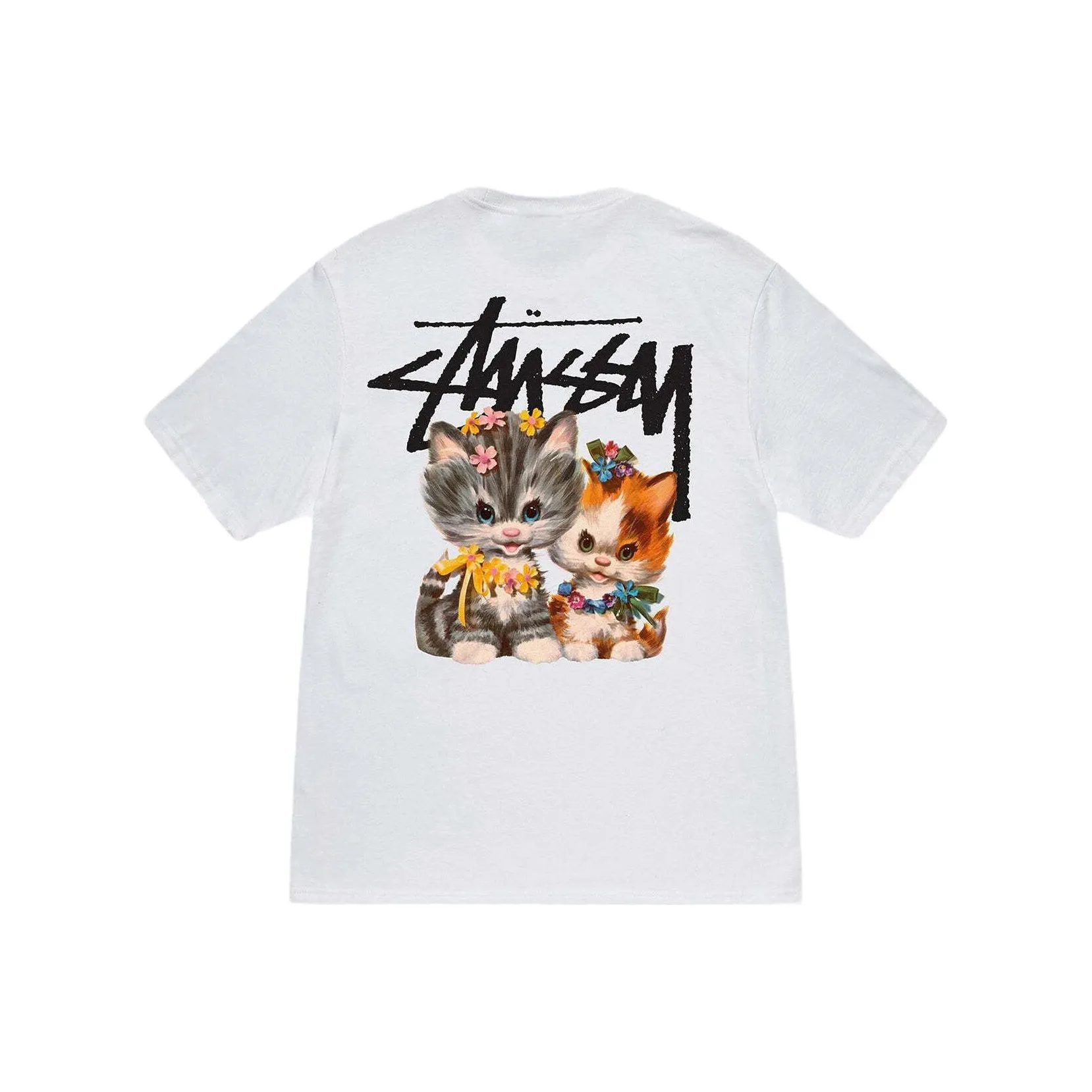 For the Stussy Kittens Tee White, inspect the overall print quality. Authentic pieces have sharp, vibrant graphics with no smudging. The fabric should feel soft and durable, and the shirt should maintain its shape without excessive stretching.