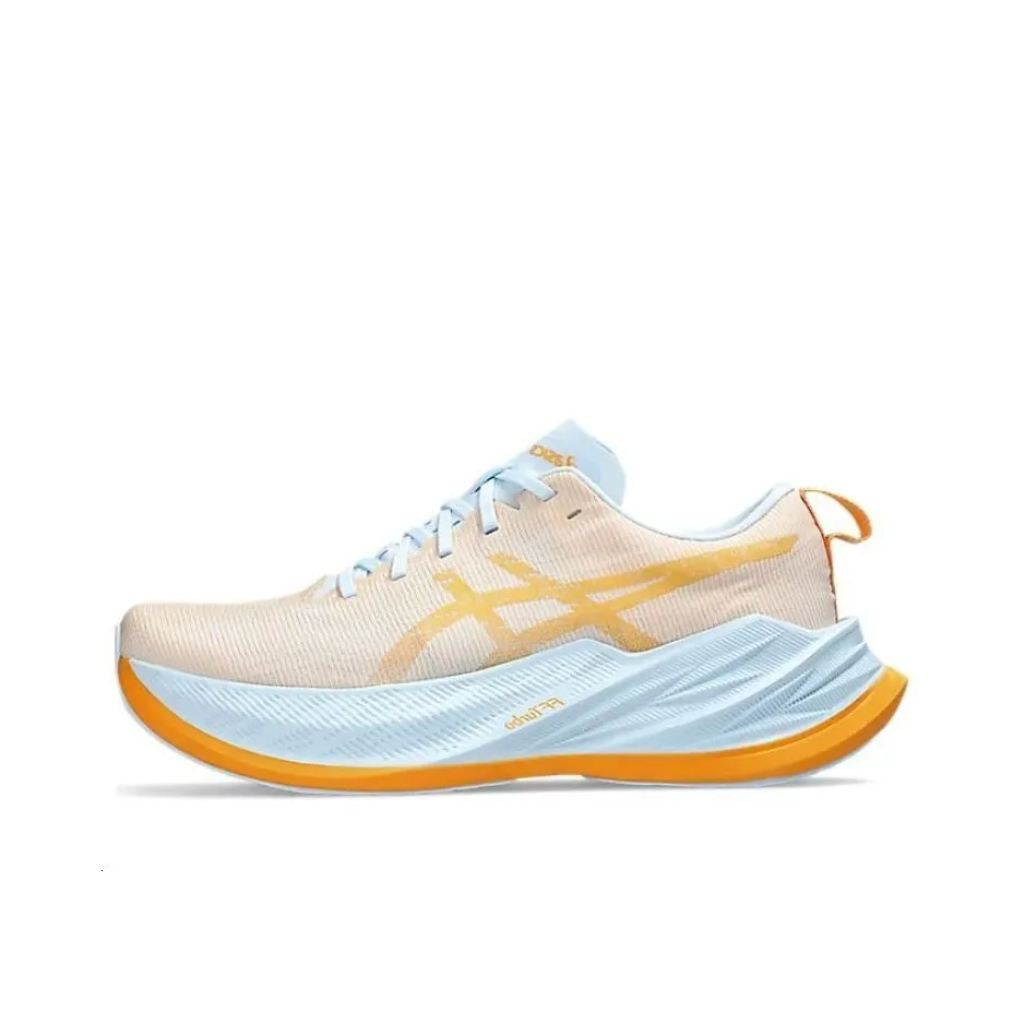 For the Asics Superblast Fellow Yellow Light Blue, authenticity can be confirmed by examining the shoe's overall construction. Authentic pairs will have a sturdy build, with no signs of glue residue or uneven seams. The colors should be bright and true to the advertised images.