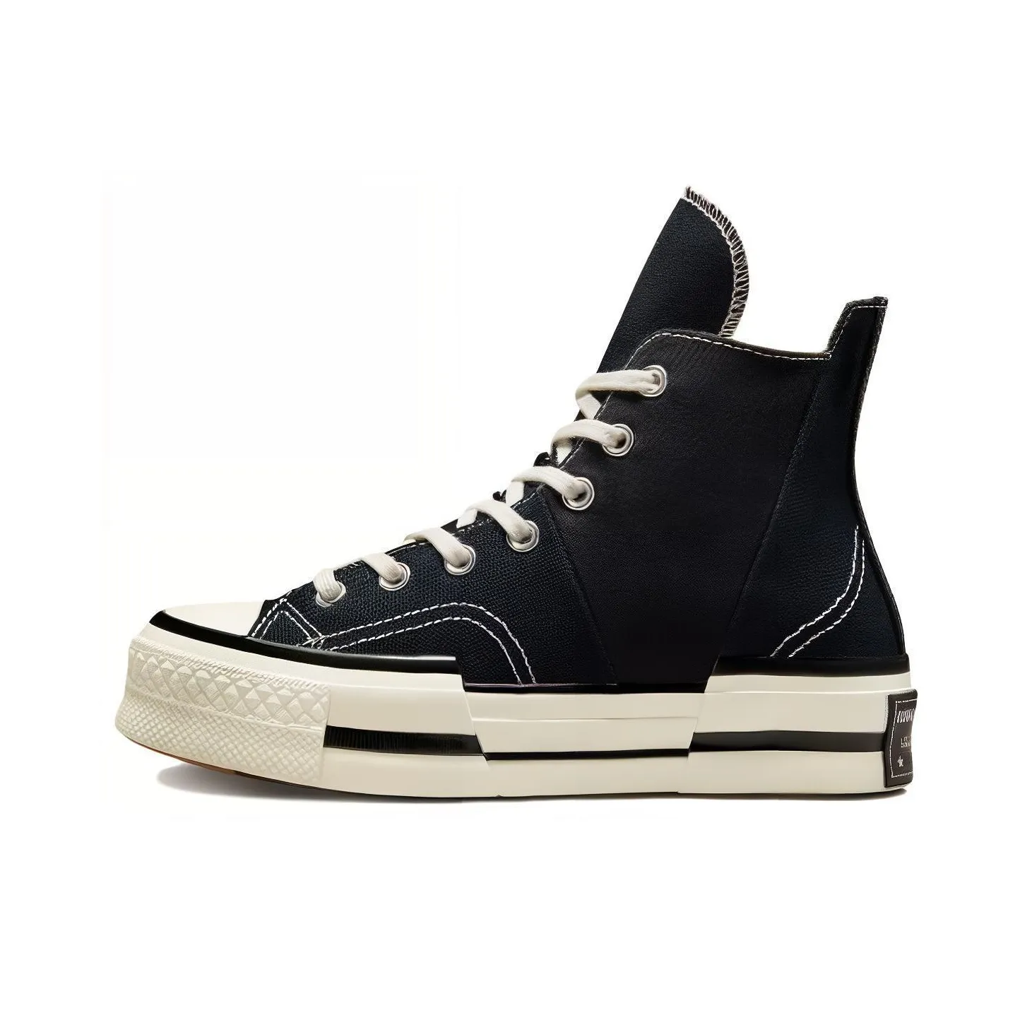 For the Converse Chuck Taylor All Star 70 Hi Plus Canvas Black White, examine the overall construction and materials. Authentic pairs will have a high-quality canvas that feels sturdy and a rubber sole with a defined tread. The stitching should be even and tight, with no loose threads. The Converse logo should be clearly visible on the side.