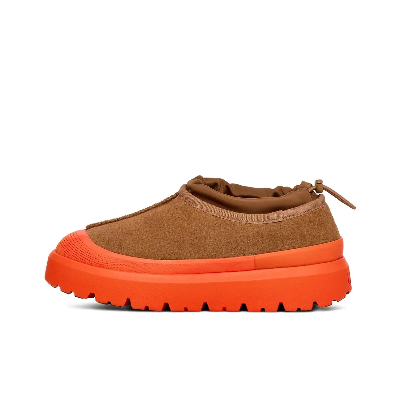 For the UGG Tasman Weather Hybrid Slipper in Chestnut Orange, inspect the upper material and color scheme. Authentic versions will have a high-quality PU upper that feels durable and looks vibrant. The round tip toe style should be well-formed, and the platform heel should provide a sturdy base.