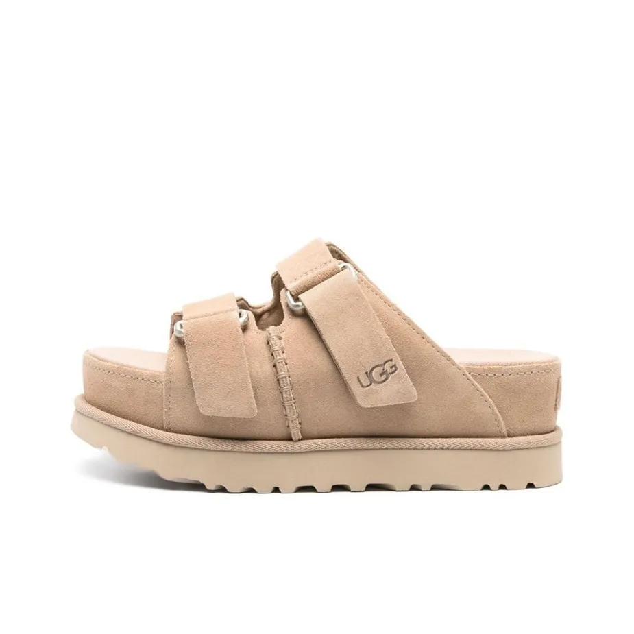 Authentic UGG Goldenstar Hi Slide Sand features a premium suede upper with a consistent texture and color. Check for even stitching and a well-constructed sole that should feel sturdy yet flexible. The platform heel should be uniform in height and shape, ensuring comfort and style.