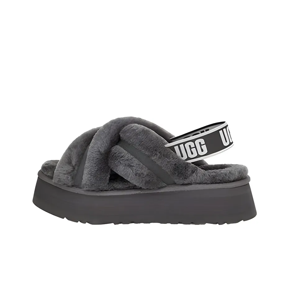The UGG DISCO Stylish Sandal Women's Gray should have a sleek design with an elastic band that feels secure. The open-toe style should be well-constructed, and the fleece-lined thickness should provide comfort without compromising style.